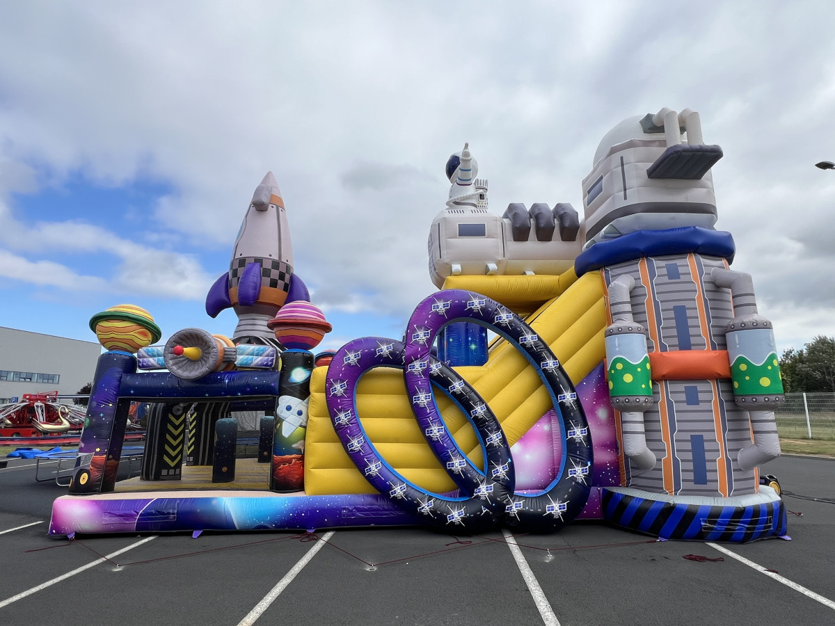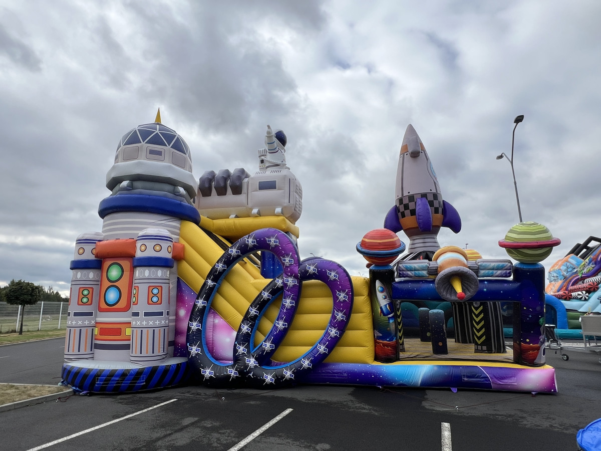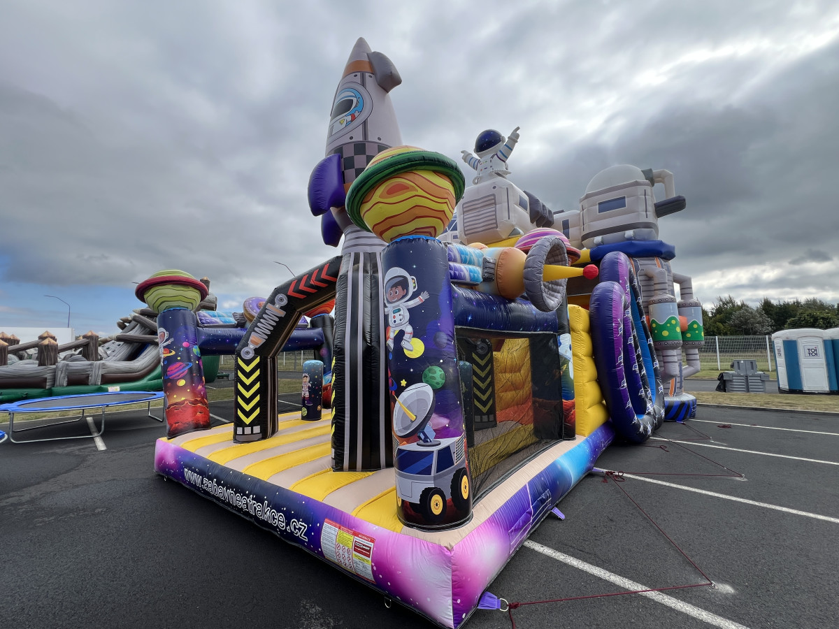 Obří aktivní centrum kosmodrom s rozměry 12 x 9 metrů obsahuje vše, co má mít raketová základna – satelity, startovací věže, lunární vozítka a spoustu kosmonautů. Děti si užijí skákací plochu v přední části atrakce, nesmí chybět výstup na vrchol a dvě nafukovací skluzavky.