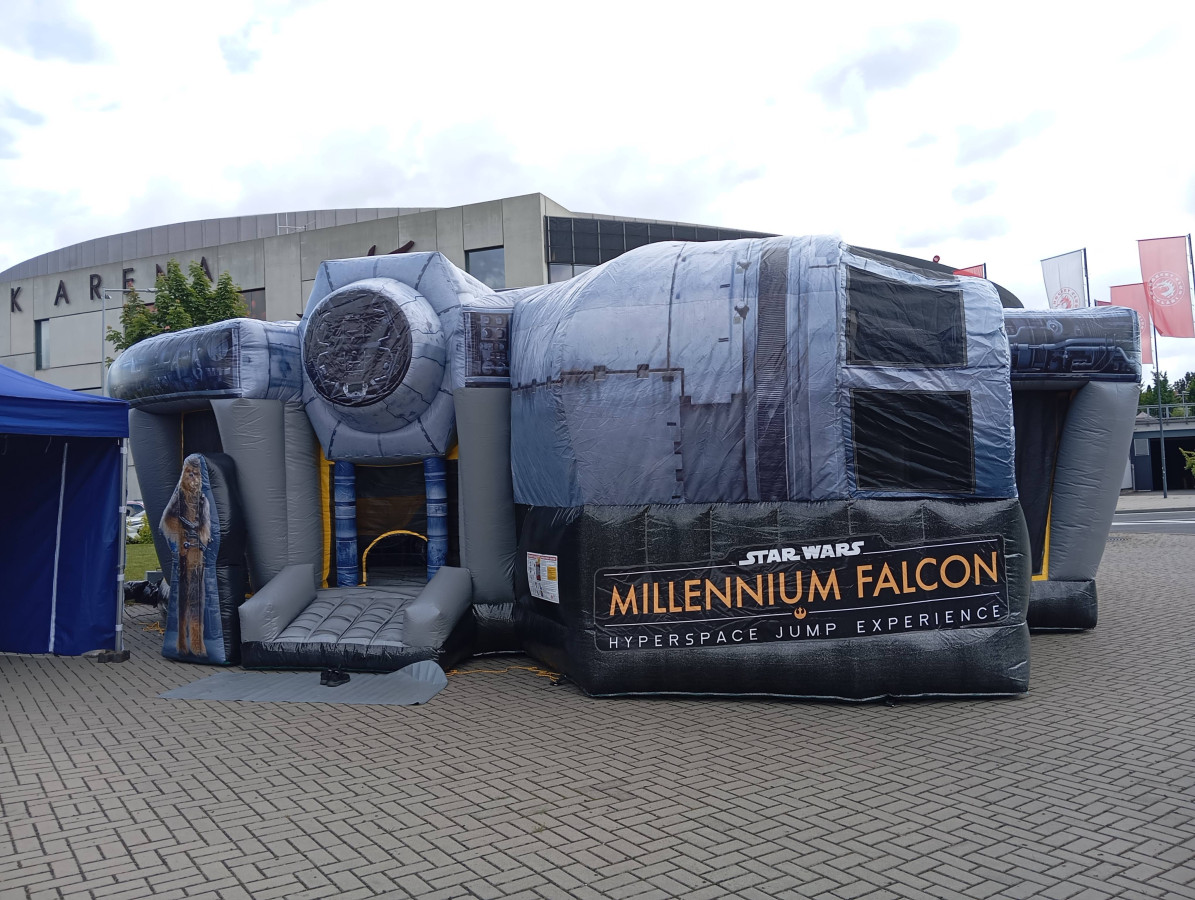 Rozměry vesmírného korábu Star Wars Millenium Falcon jsou úctyhodné – 11x9m a tak se nafukovací atrakce Star Wars stává jednou z top atrakcí k pronájmu v ČR.