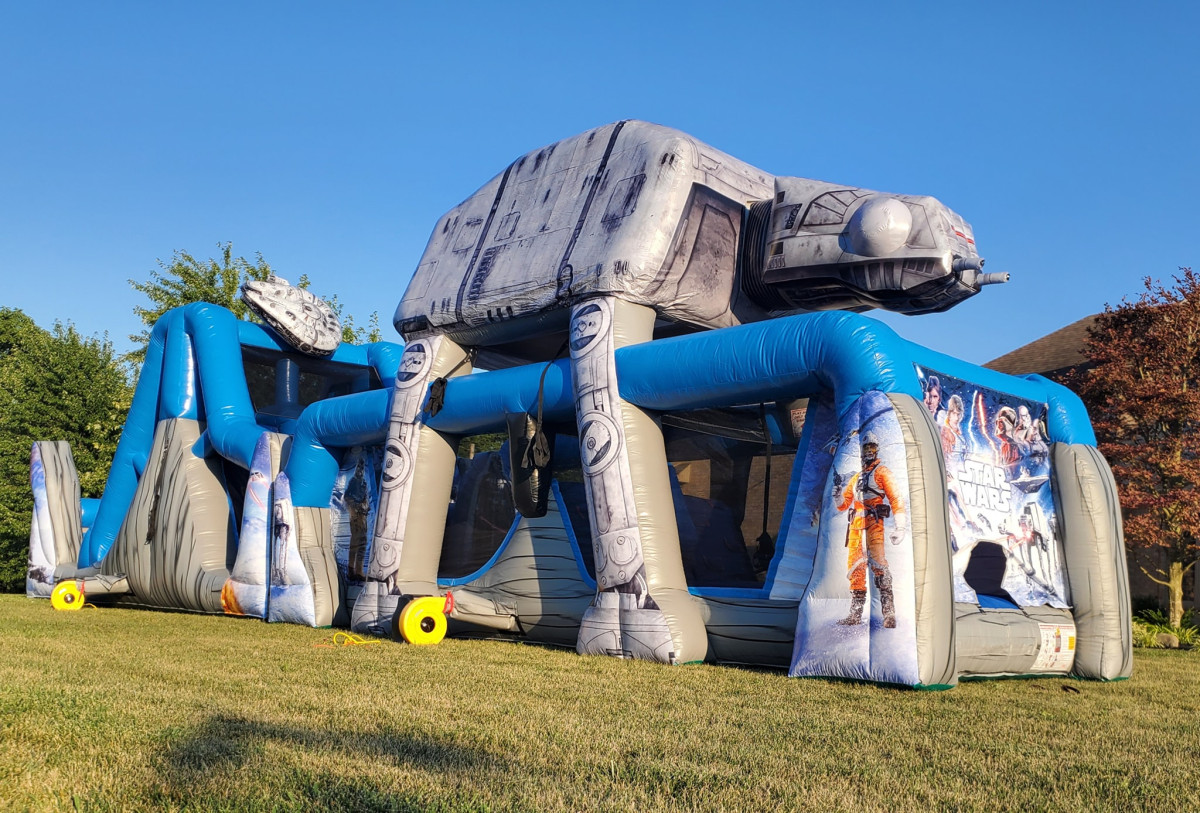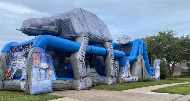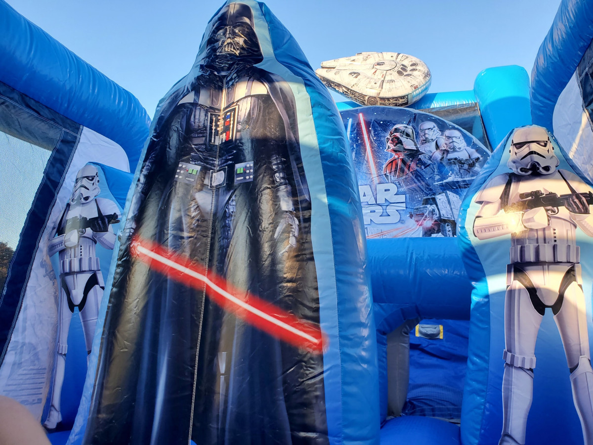 Patnáctimetrová nafukovací překážková dráha Star Wars s postavami jako je Darth Vader nebo Stormtrooper exkluzivně k pronájmu jen u www.zabavneatrakce.cz ! Děti si užijí skákání, výlezy na horolezeckou stěnu, překážky a závěrečný sjezd.
