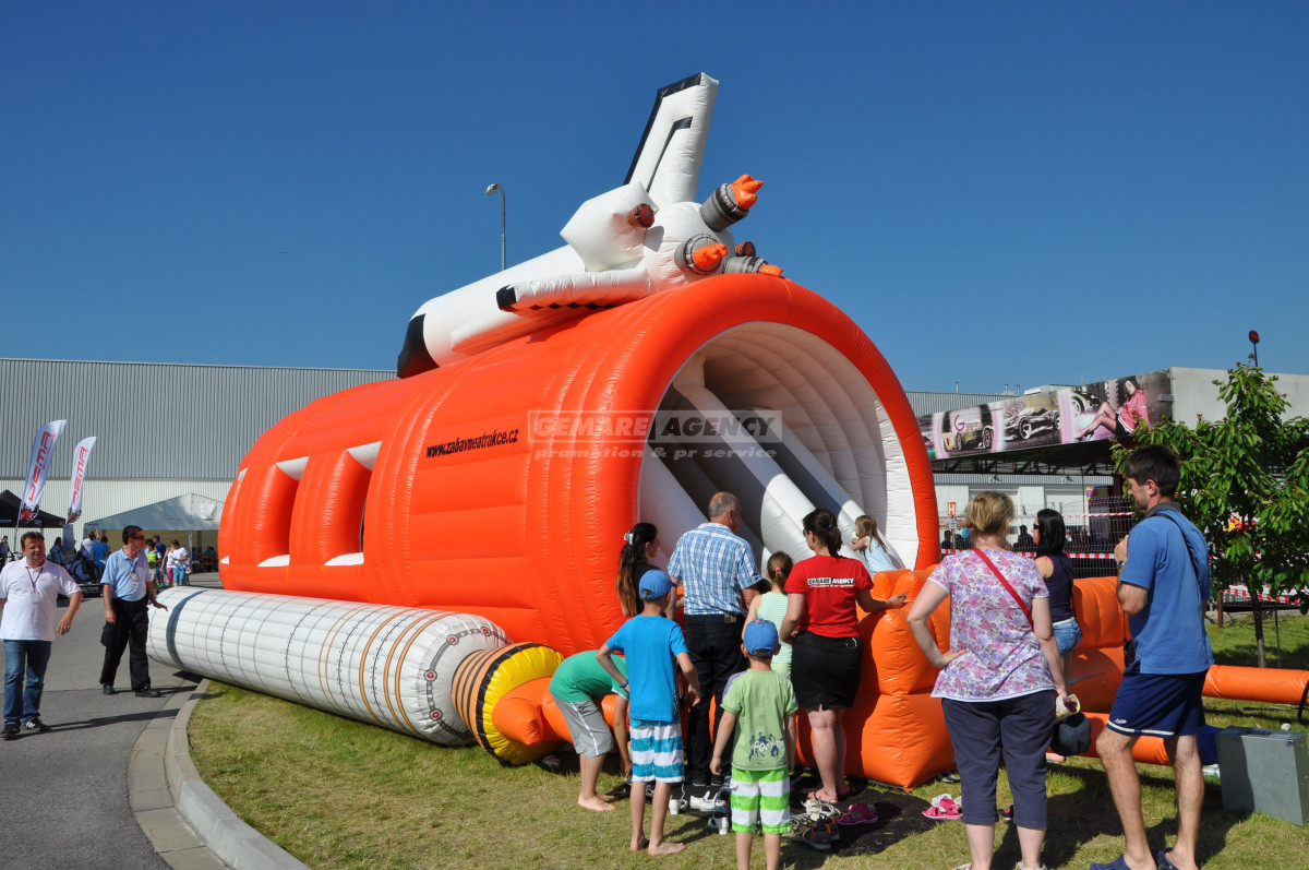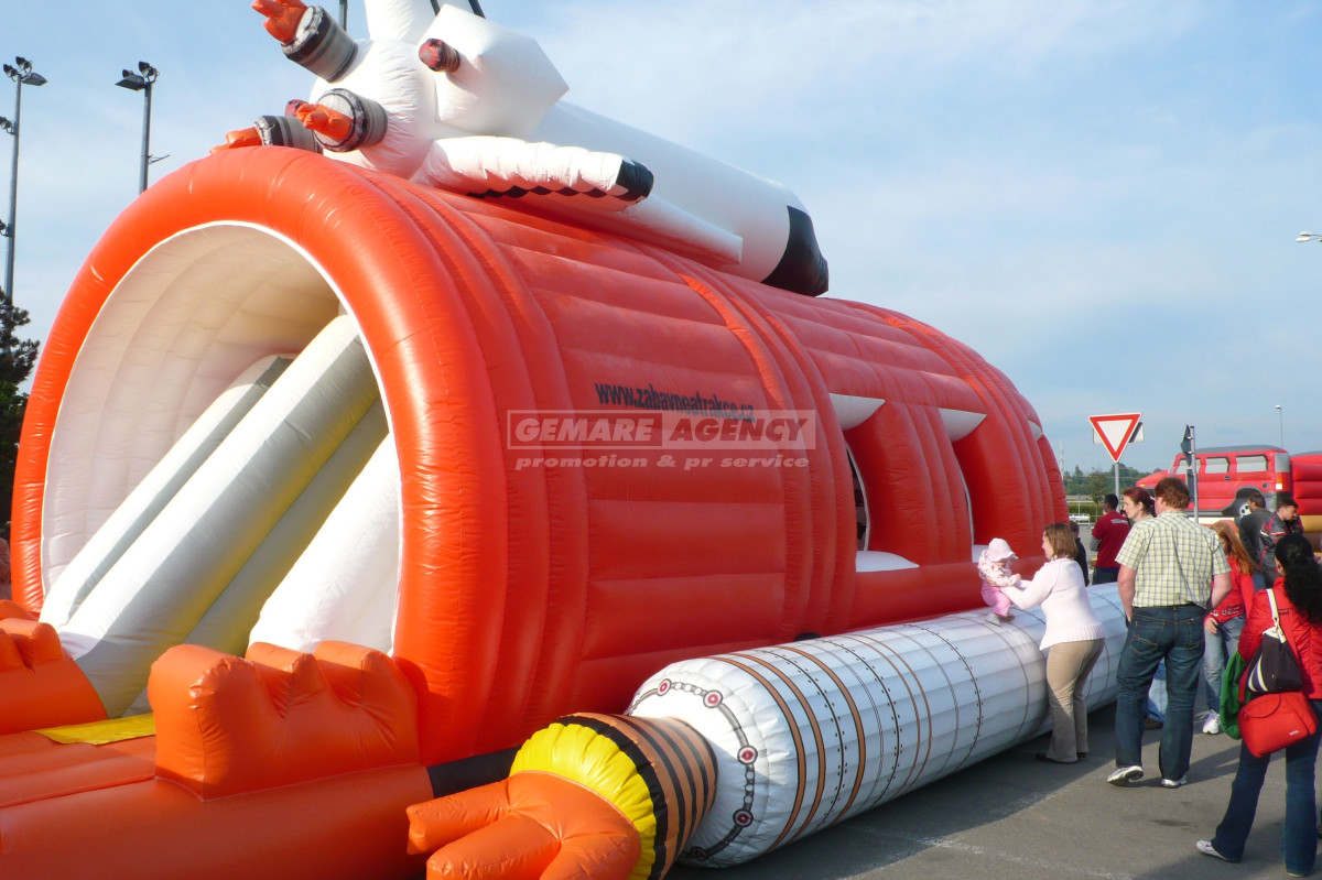 Aktivní centrum Raketa přitáhne na Vaší akci každého správného kluka i holku. Neobvyklý design Aktivního centra v podobě velké nafukovací rakety ve spojení s principem skákacího hradu a skluzavky totiž zaujme na první pohled. Spousta divoké zábavy potěší všechny malé kosmonauty i kosmonautky! Vyzkoušejte neobvyklé Aktivní centrum Raketa!