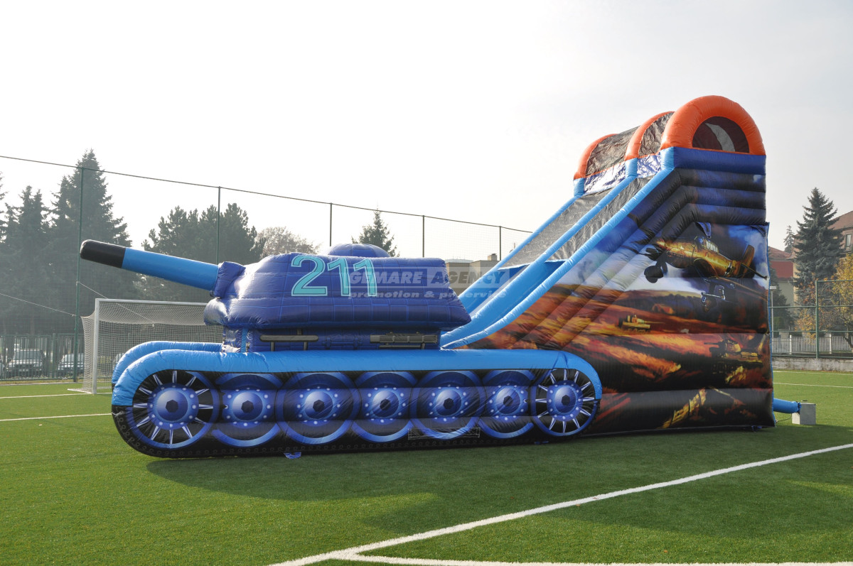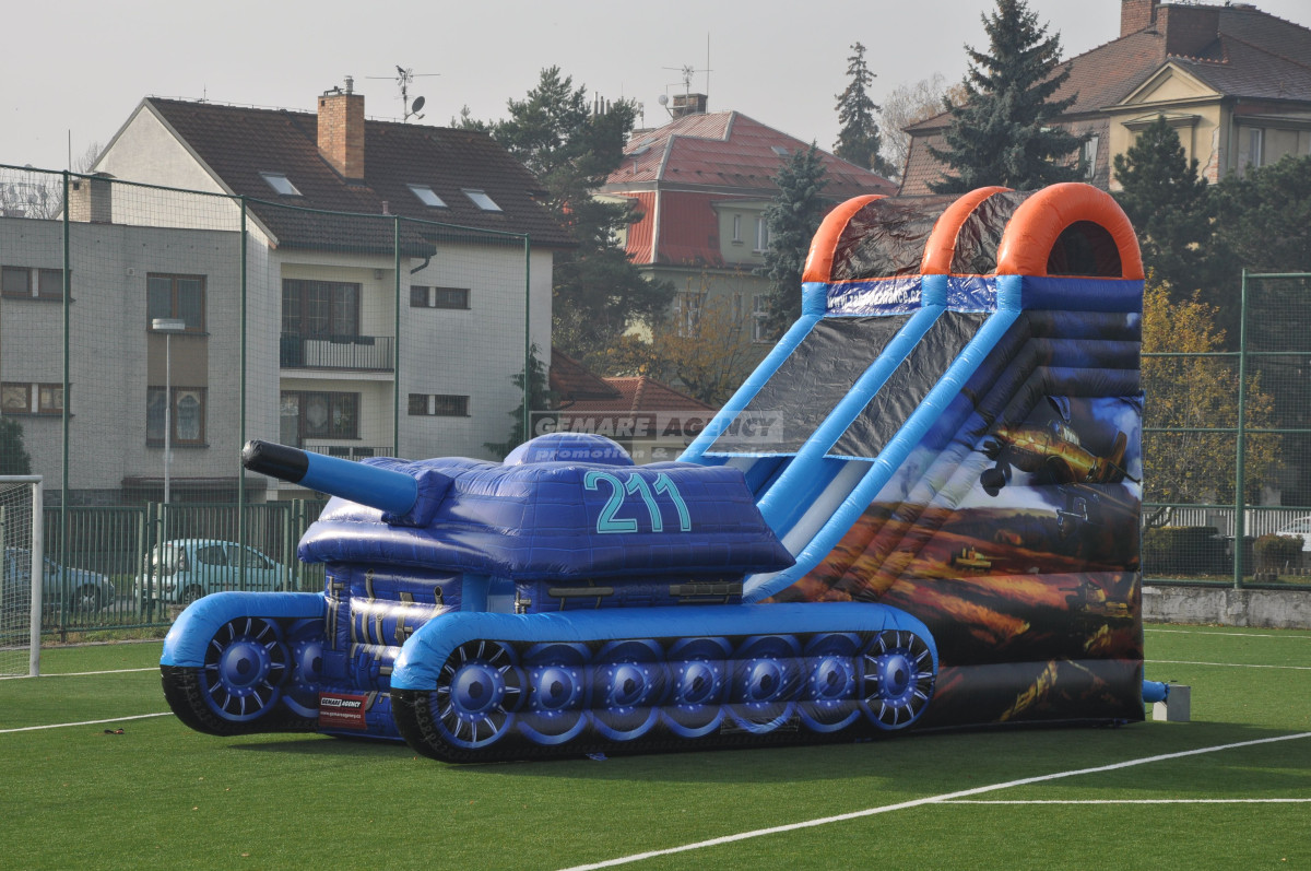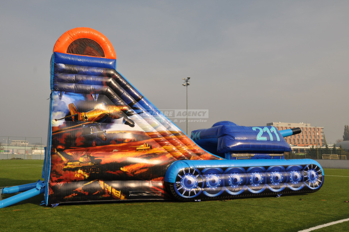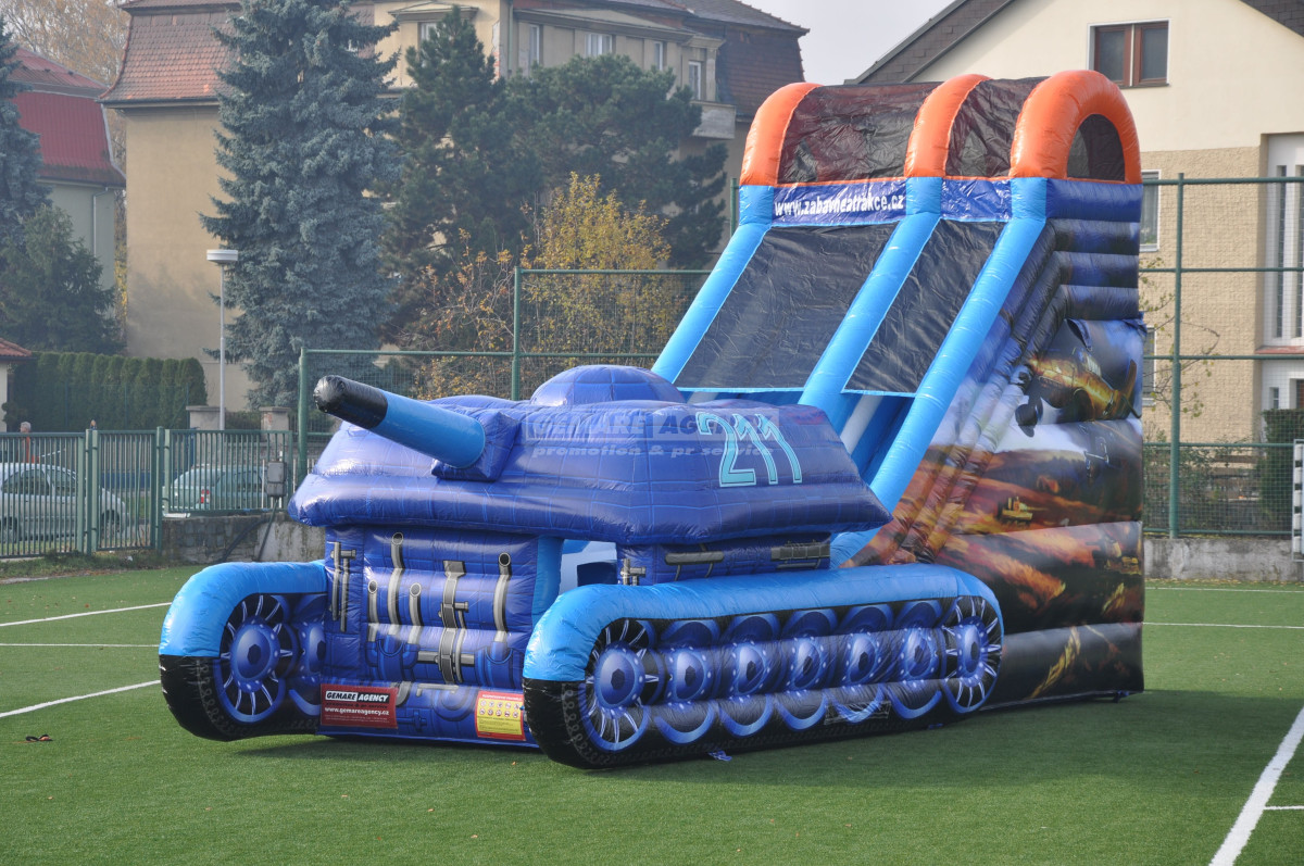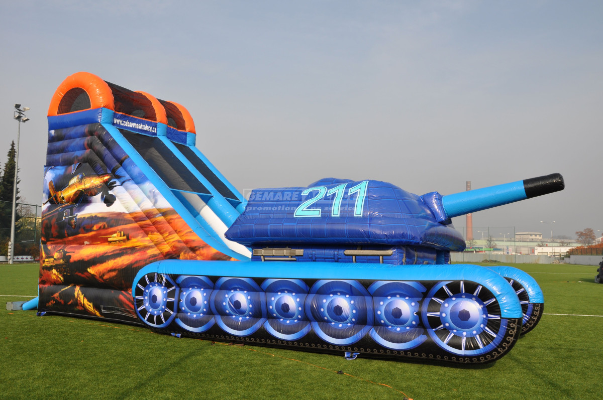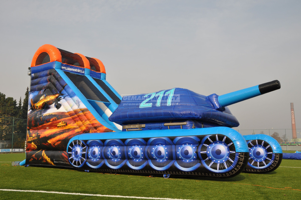 Nejoblíbenější atrakce mezi kluky, to je nafukovací skluzavka Tank. Kromě ilustrace tanku je atrakce ozdobena také boční grafikou s letadly. Jedná se o ideální atrakci pro akce s vojenskou tematikou. Nabízíme k pronájmu jako jediní v ČR.
