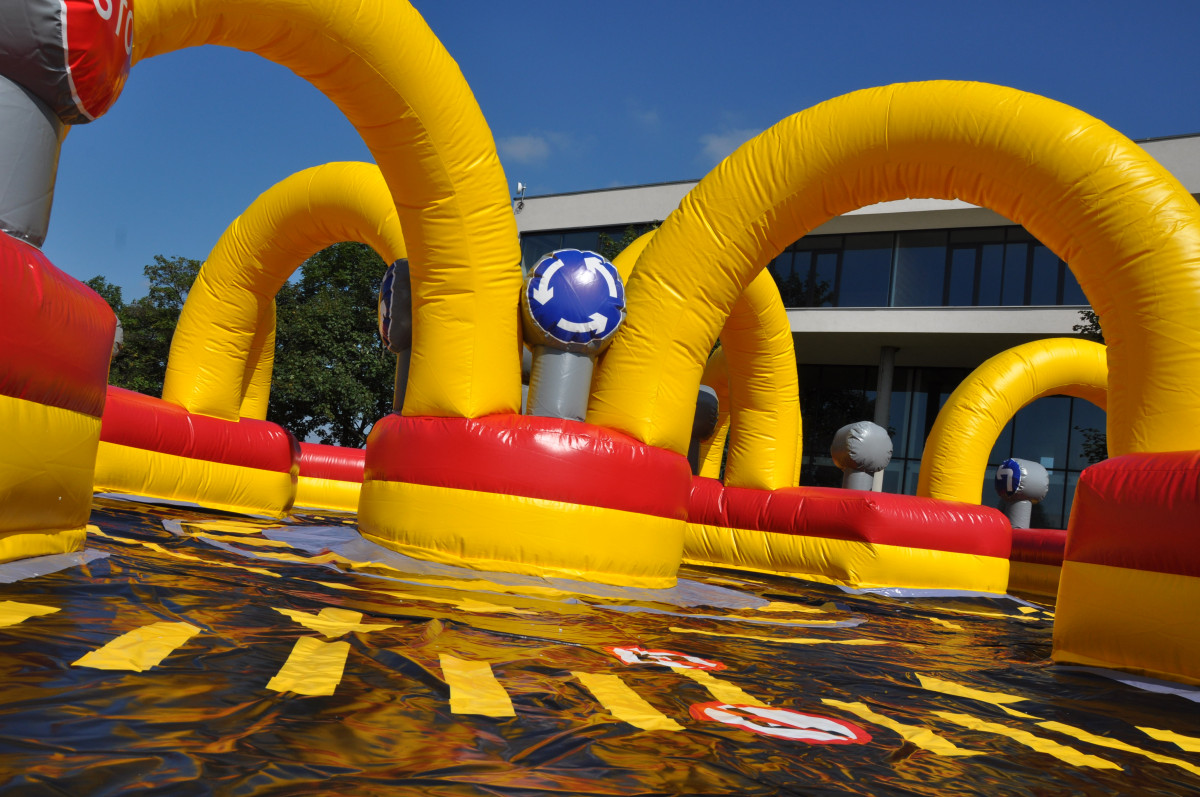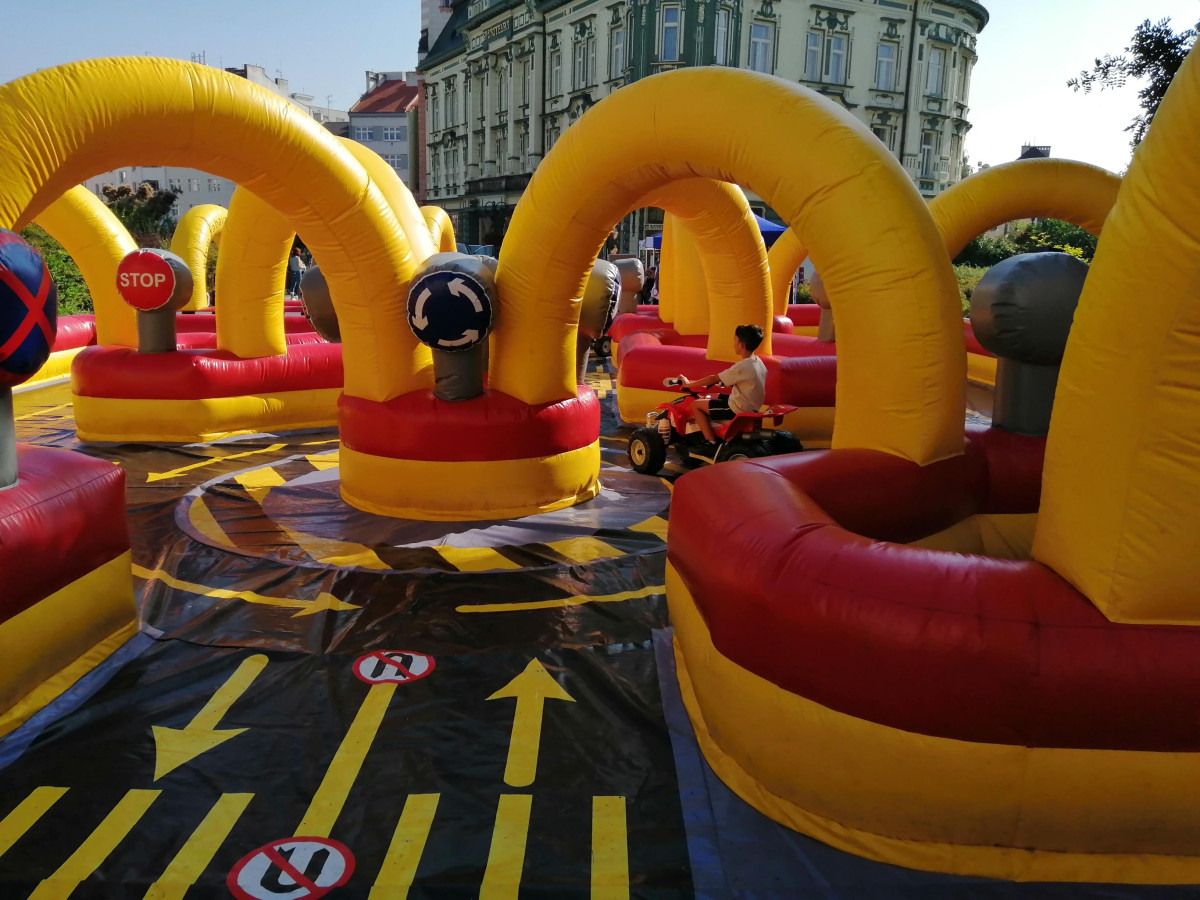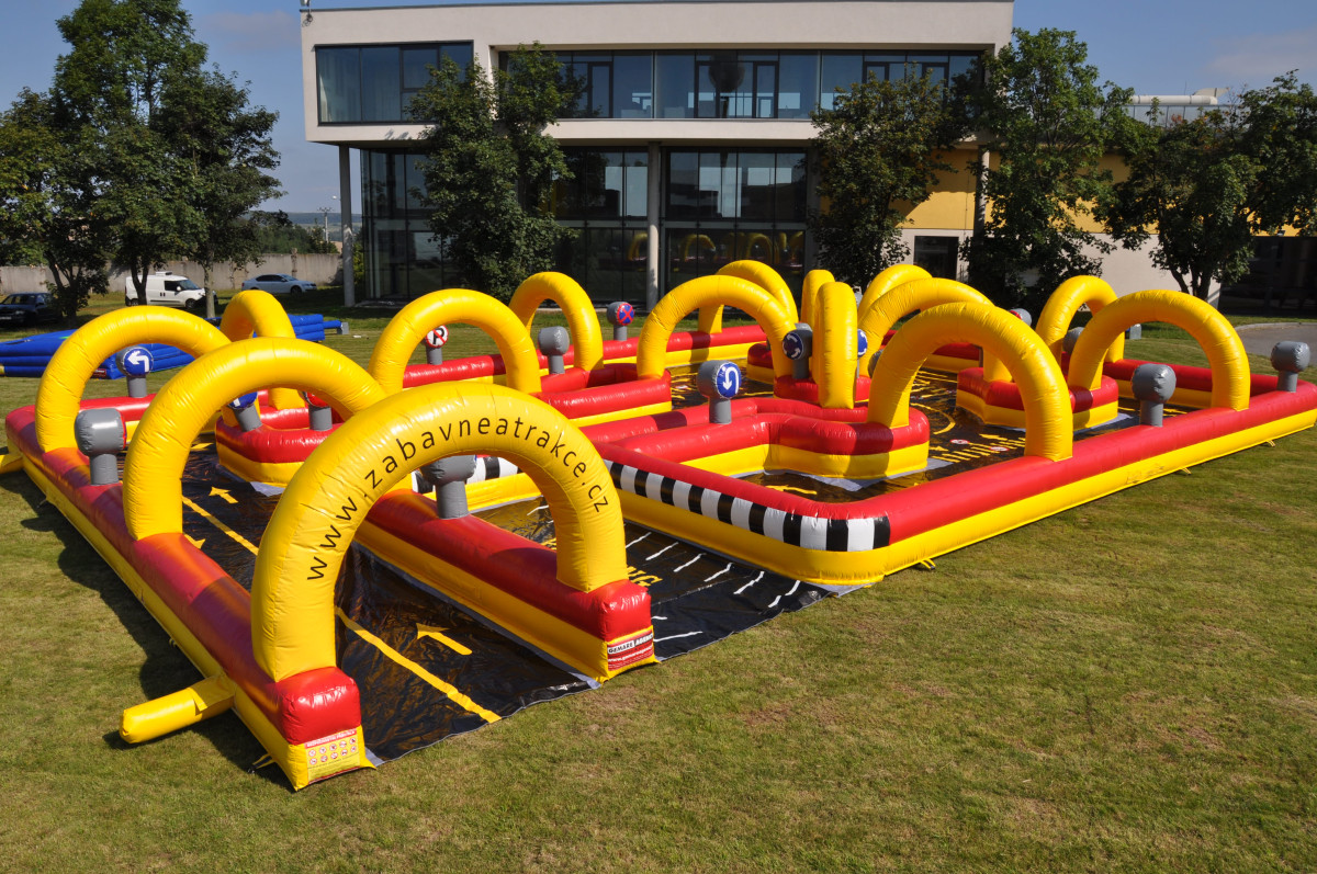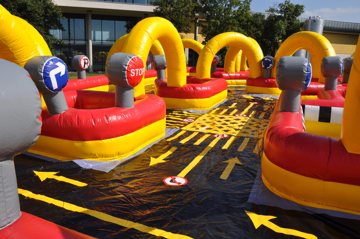 Obří dopravní hřiště o rozměru 19 x 12 m, je plné dopravního značení a děti se v něm pohybují na šlapacích autíčkách. Atrakci lze využít i jako součást programu dopravně bezpečnostních akcí. Pronájem nafukovací atrakce dopravní hřiště doporučujeme zkombinovat společně se simulátorem nárazu nebo simulátorem přetočení vozidla. |