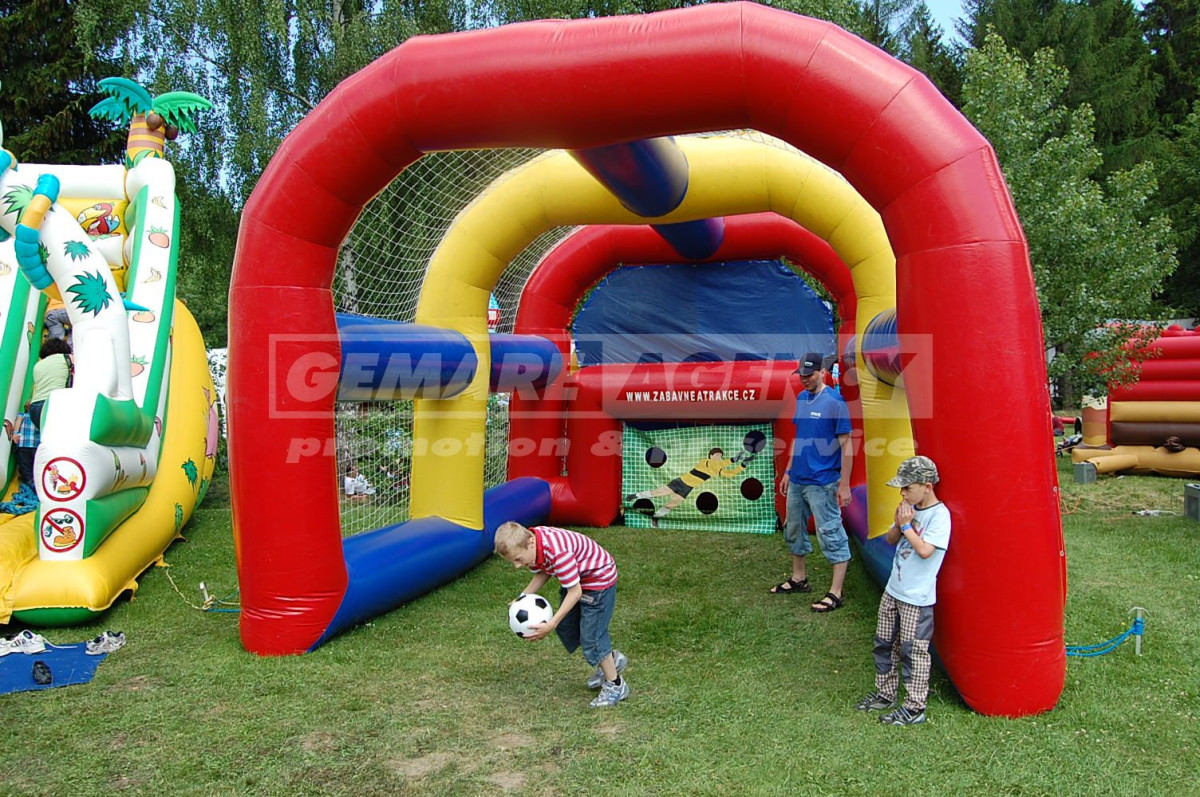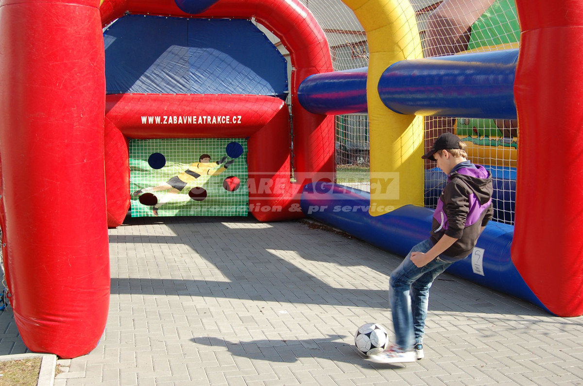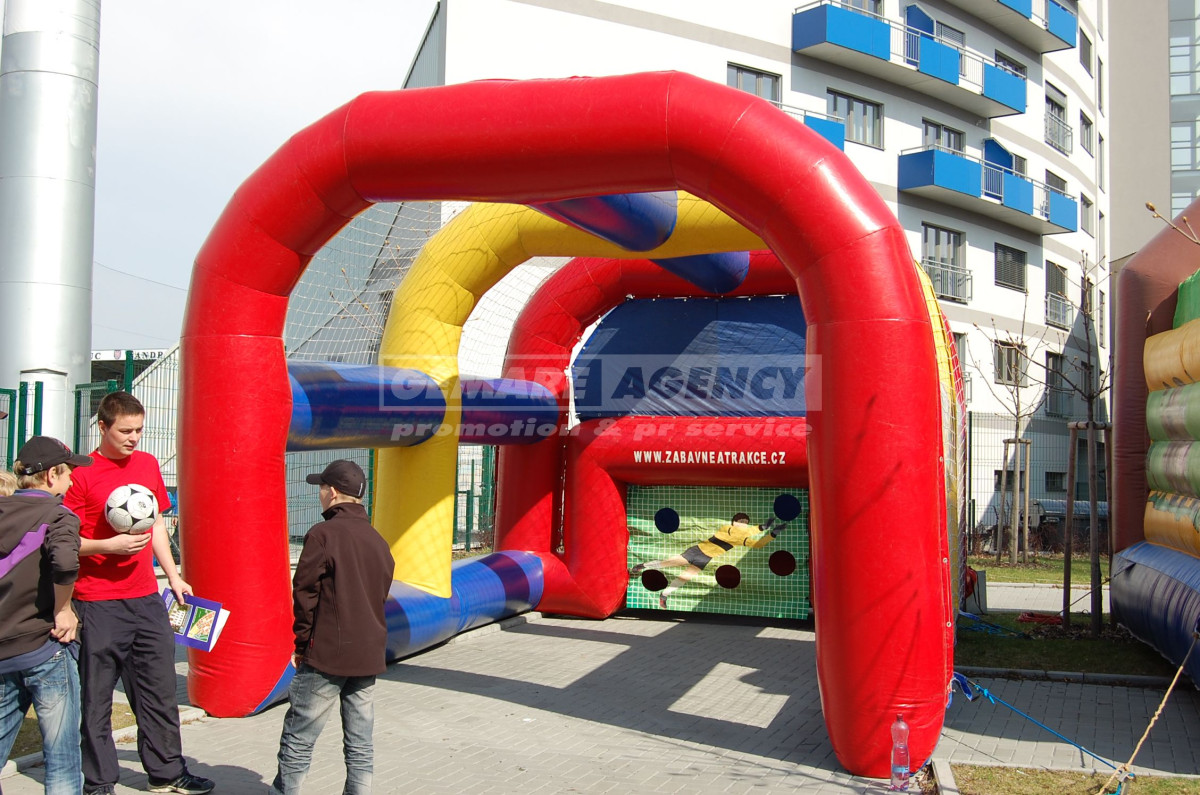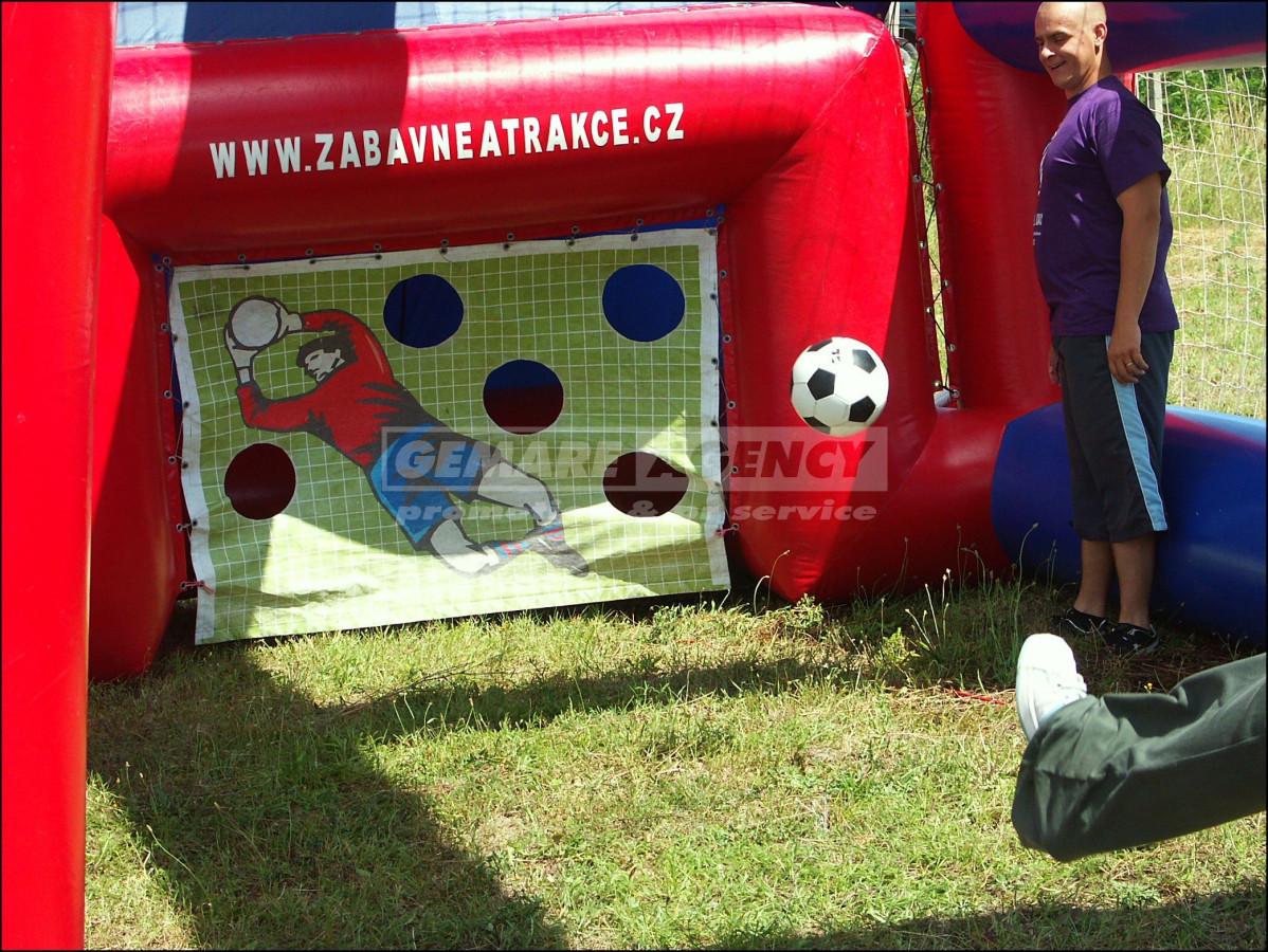 Atrakce fotbalová branka je další z řady fotbalových atrakcí. Úkolem soutěžících na fotbalové brance je přesně zamířit a dát gól do vyhrazeného otvoru. Nafukovací fotbalová branka spolu s namalovaným brankářem a otvory pro skórování zpestří nejen Vaši roadshow a firemní teambuilding, ale i akce pro širokou veřejnost plné dovednostních soutěží.