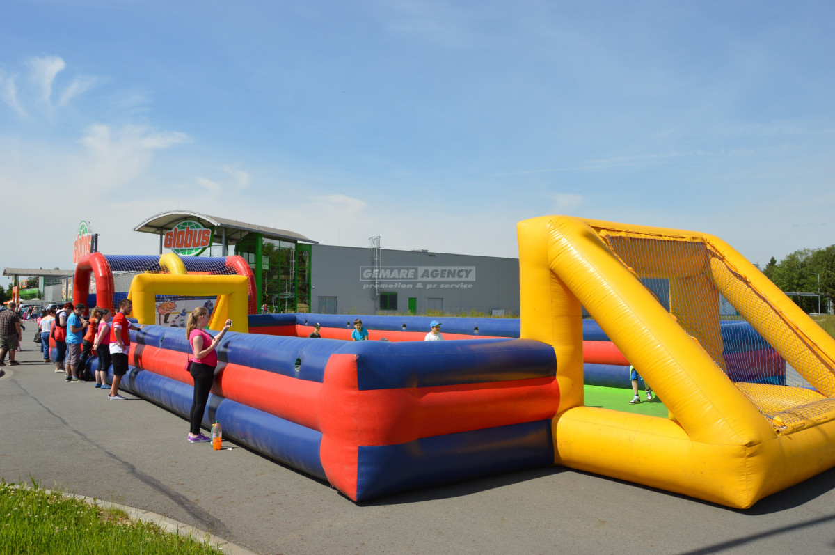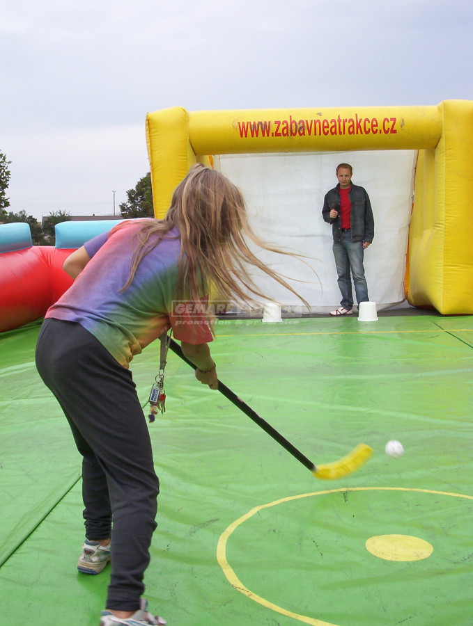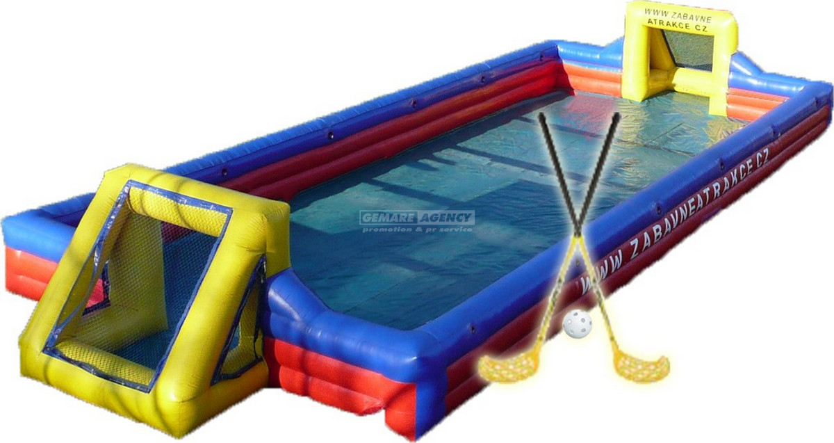 Nafukovací hokejové hřiště o rozloze 10 x 20 m je ideální plochou na uspořádání turnaje v pozemním hokeji. Atrakce svou velikostí a počtem hráčů (2 brankáři a 10 hráčů) zaručeně upoutá pozornost v každé fun zóně a přiláká širokou veřejnost k podívané. V letních měsících lze hřiště naplnit z části vodou.