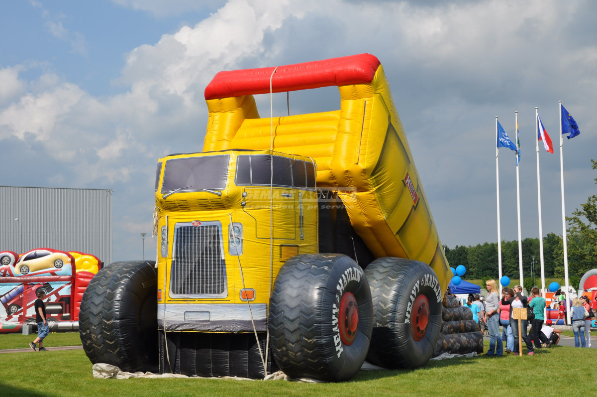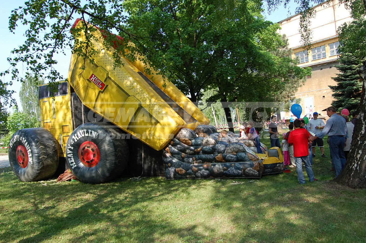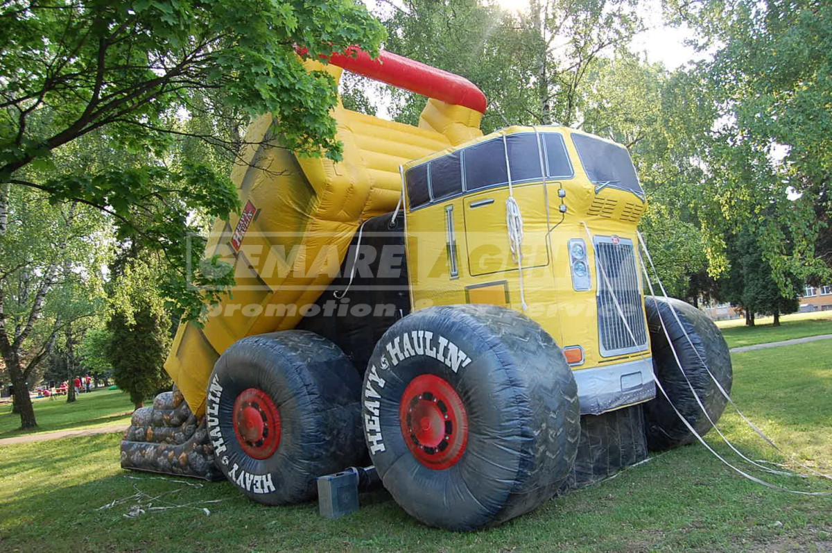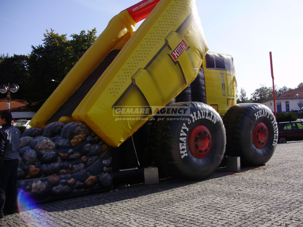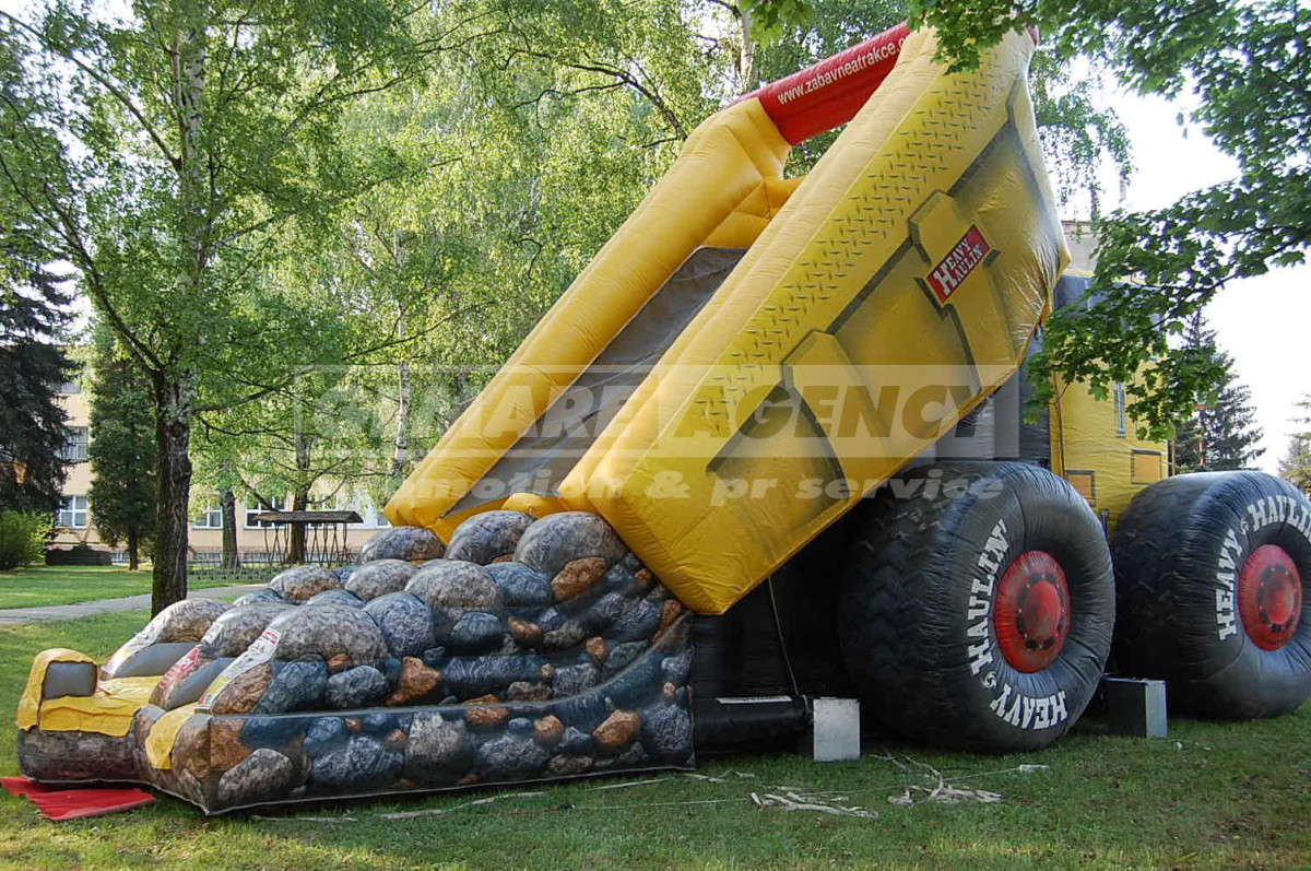Nafukovací skluzavka ve tvaru obrovského nákladního auta, sypajícího hromadu kamení, je další z exkluzivních nafukovacích skluzavek. Netradiční design nafukovací skluzavky přiláká spoustu zvědavých pohledů a návštěvníků. Nafukovací skluzavka "náklaďák" je vhodná pro prezentační akce prodejců nákladních vozidel, autosalony a veletrhy.