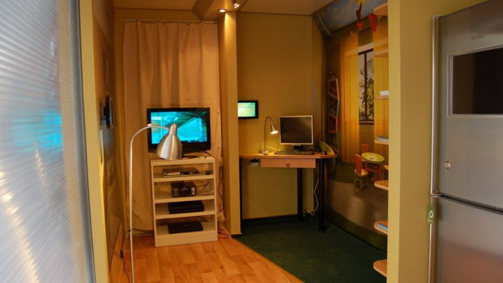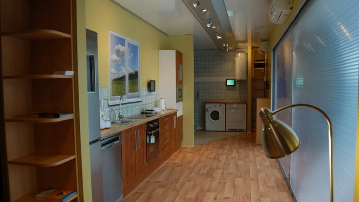 Vnitřní výbava prezentačního přívěsu XXL: osvětlení, rozvody el. energie, klimatizace.