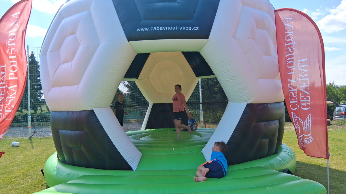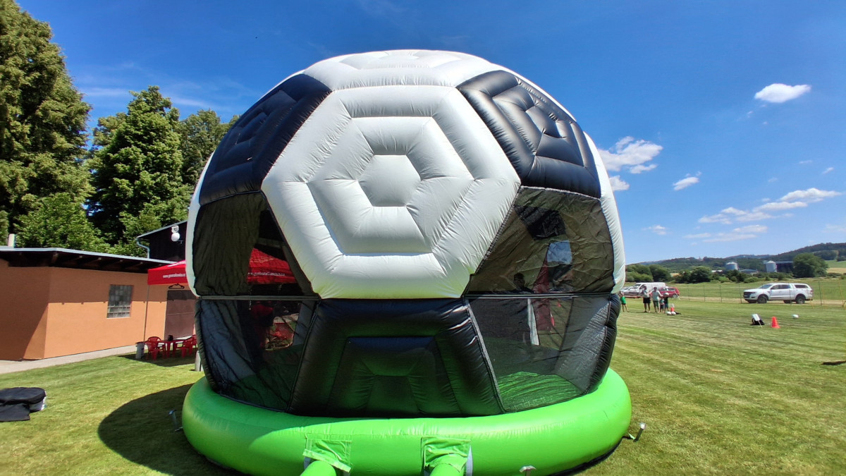 Nabízíme Vám jedinečný skákací hrad pro malé fotbalisty. Nafukovací skákací hrad fotbalový míč (skákací hrad "kopačák") je výborným doplňkem sportovních akcí a událostí s tématikou fotbalu. Skákací hrad fotbalový míč je zastřešený.