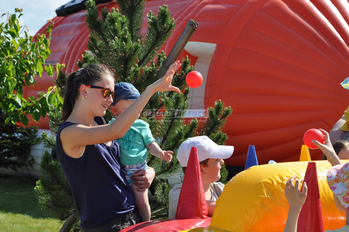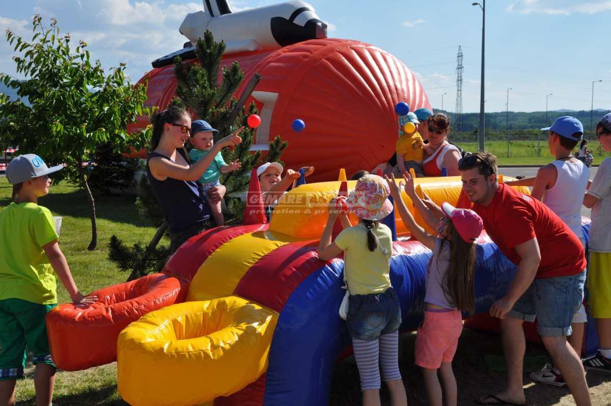 Netradiční řešení stolní hry v podobě nafukovací atrakce, která je opatřena kužely. Úkolem soutěžících je pomocí proudu vzduchu z jednotlivých kuželů přesunout míček až do koše. Atrakce airball je vhodná k pronájmu pro dětský den, family day, teambuilding nebo firemní akce.