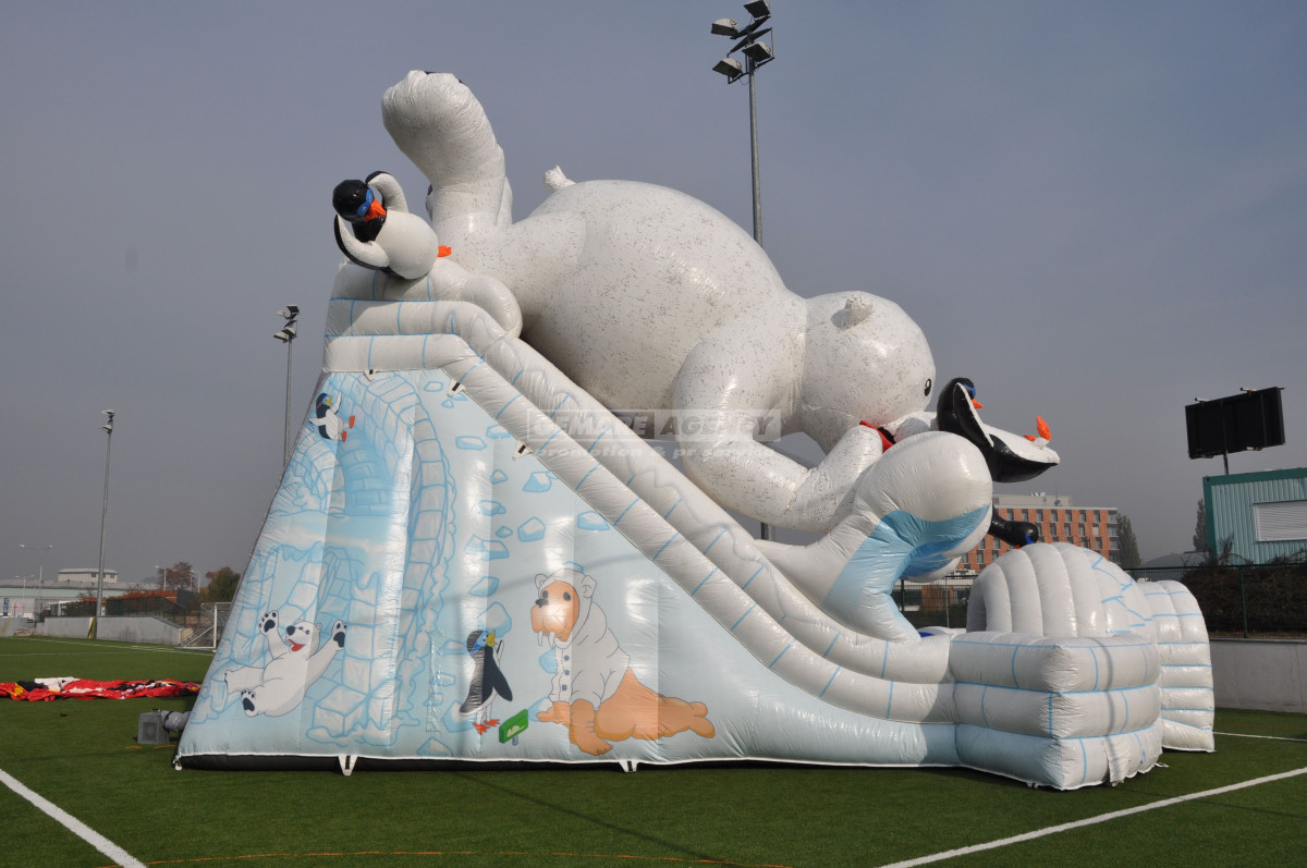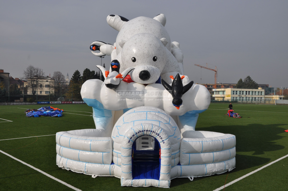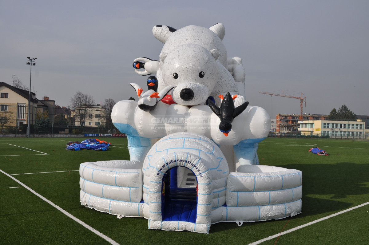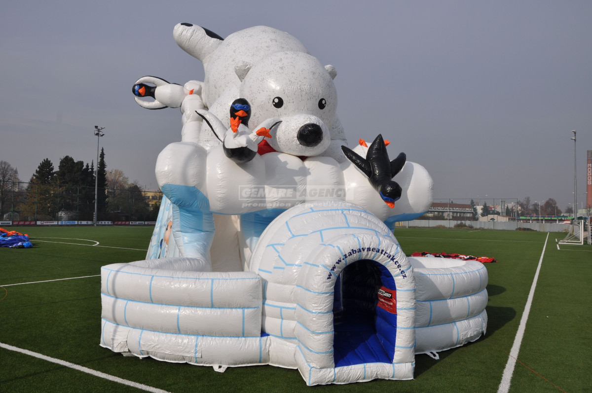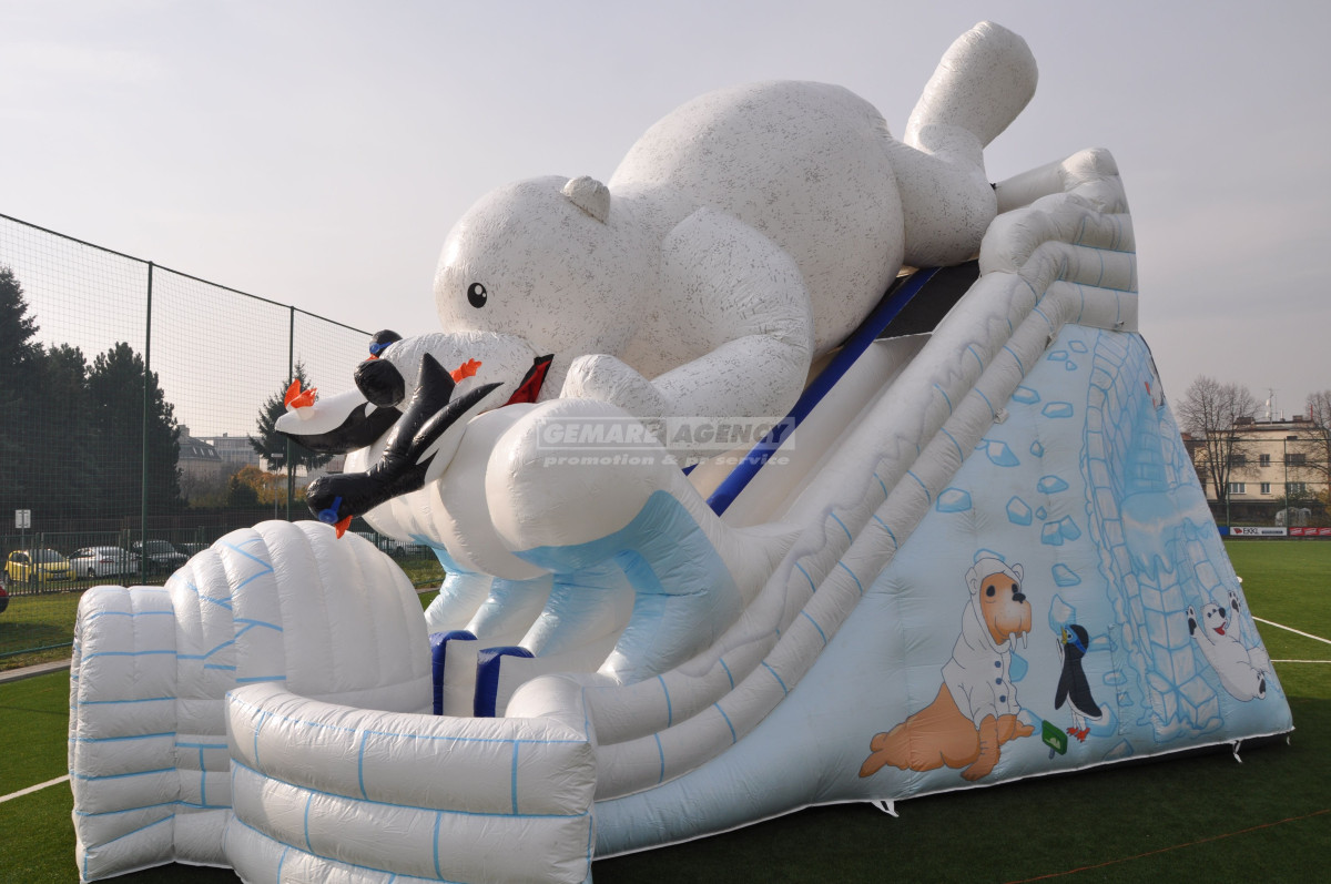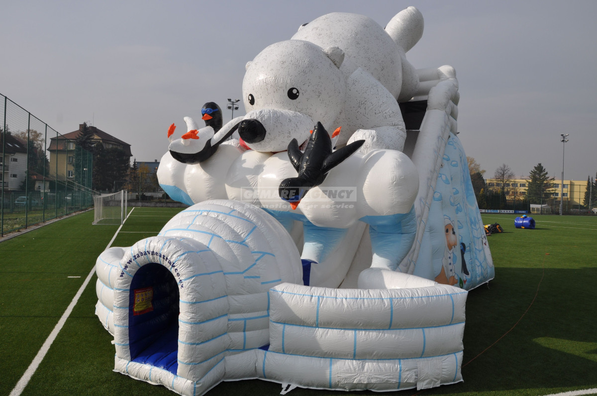 Exkluzivní nafukovací skluzavka Lední medvěd. Proč nezažít zimní radovánky v létě? Jako vstup vás překvapí stylové iglú, s dovádějícími tučňáky a velkým ledním medvědem, který na vše dohlíží. Pronájem obří nafukovací skluzavky "Lední medvěd" je vhodný pro dětský den, firemní akce, roadshow nebo reklamní akce. Ideální akce s tématikou "Frozen", nebo "Zimní radovánky".