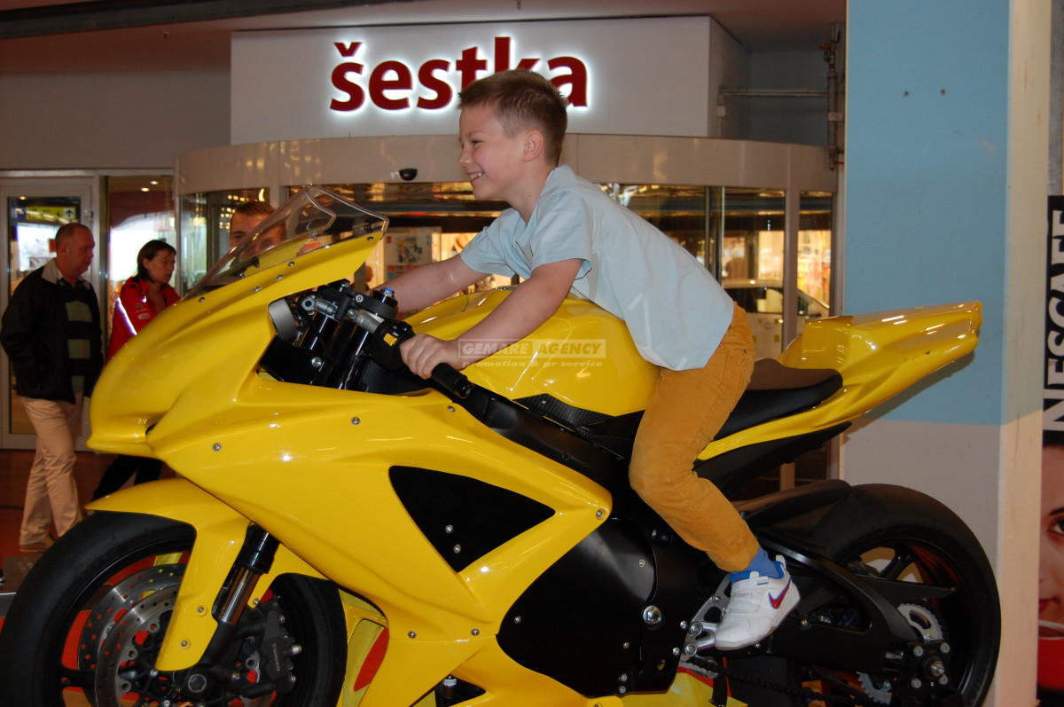 Zažijte pocity jezdců jako je Valentino Rossi, Loris Capirossi nebo Casey Stoner a projedete se na světových okruzích včetně toho brněnského. Závod si užijete včetně reálných pohybů jako na skutečné motorce. Při akceleraci postavíte motorku na zadní, při brzdění naopak „jdete" na přední kolo. Samozřejmostí jsou boční pohyby na obě strany. Celou jízdu na simulátoru motorky sleduje jezdec i přihlížející na LCD televizi o úhlopříčce 106 cm.