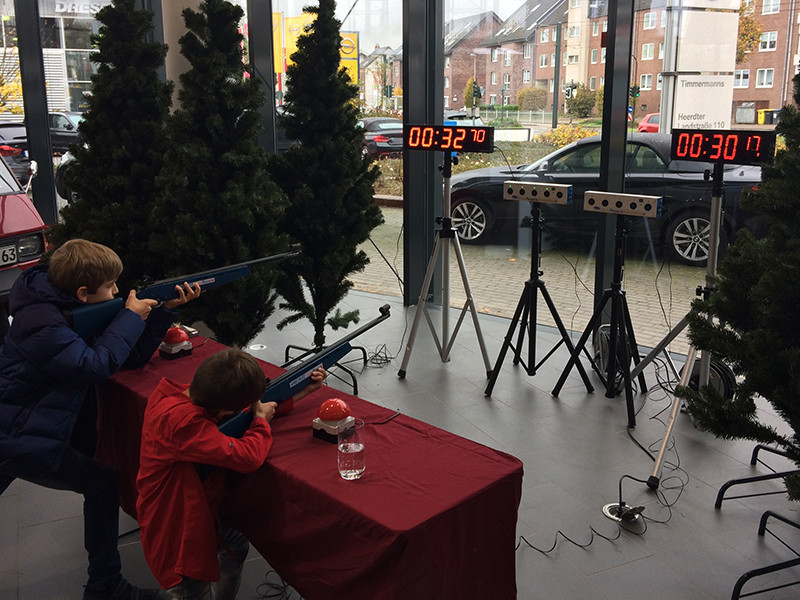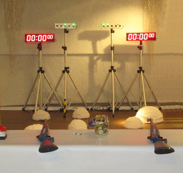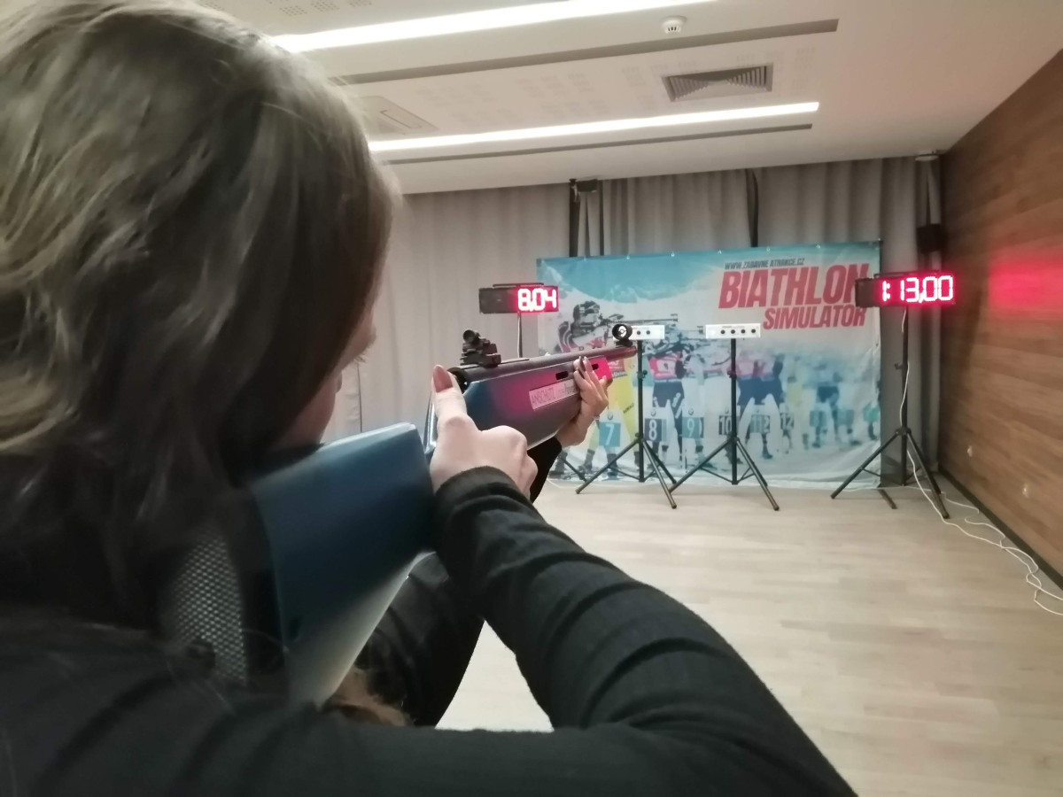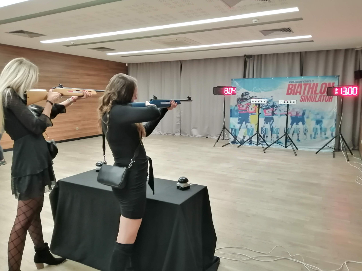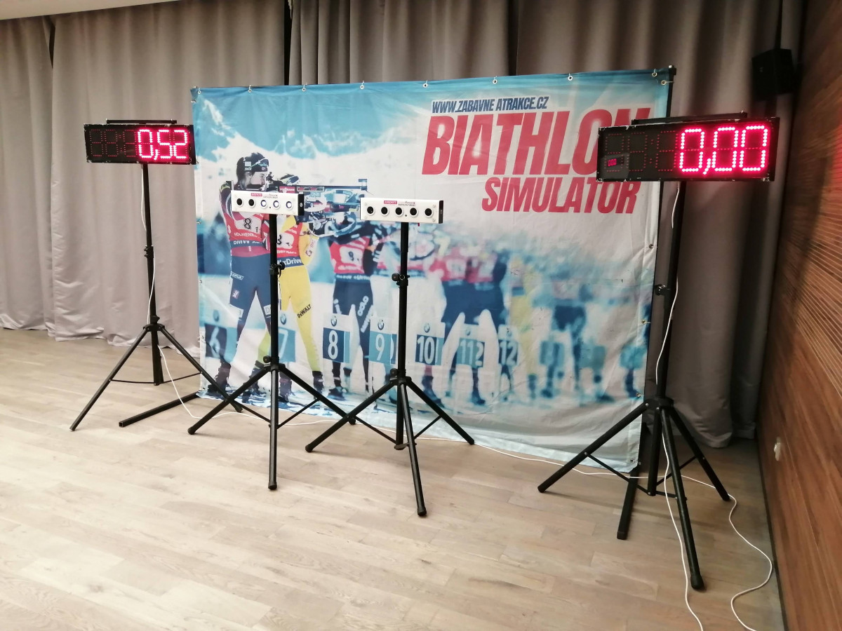 Biatlonový simulátor je určen pro 2 hráče, kteří pomocí laserové zbraně musí zasáhnout 5 bodů terče v nejrychlejším čase. Pronájem biatlonového simulátoru patří mezi oblíbené pro firemní akce, večírky, sportovní akce a teambuildingy, ale i dětské dny nebo family day. V případě zájmu o pronájem biatlonového simulátoru pro venkovní akce, doporučujeme včetně pronájmu nůžkového stanu. Biatlonový simulátor je určen pro dospělé i děti.