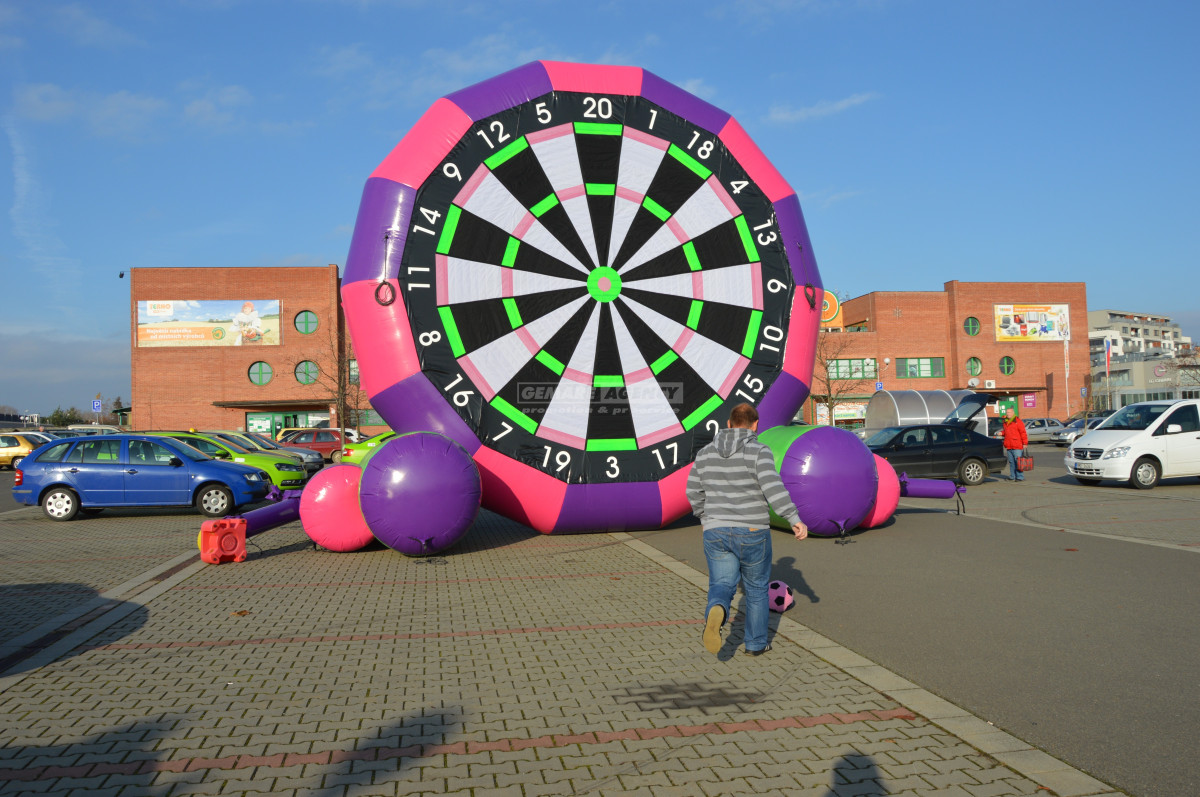 Atrakce fotbalové obří šipky je určena pro všechny věkové skupiny.
