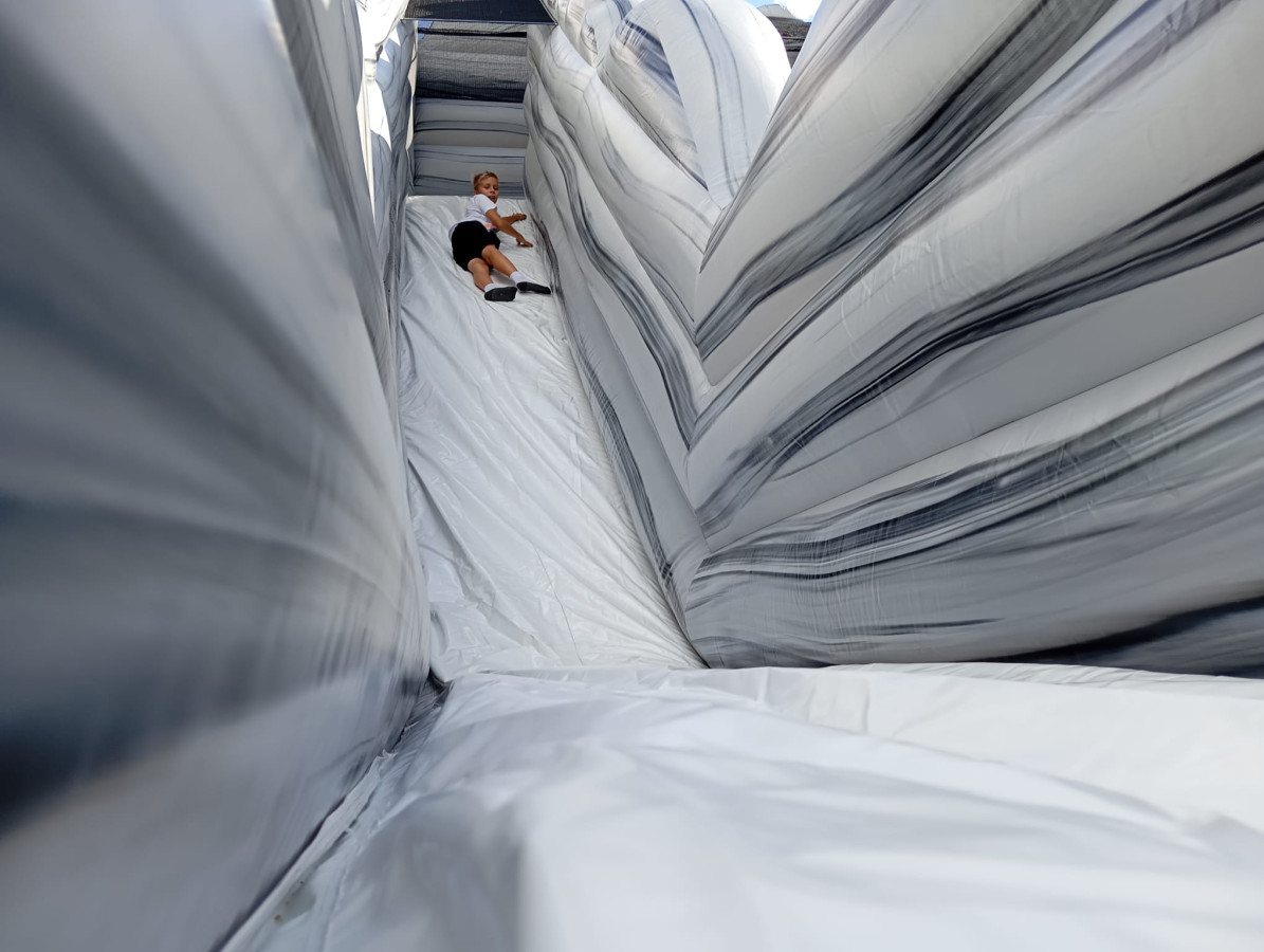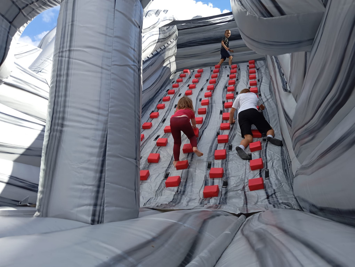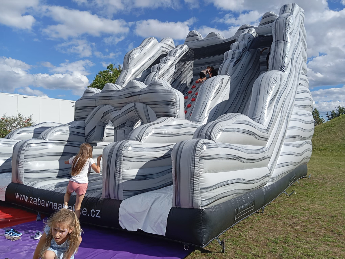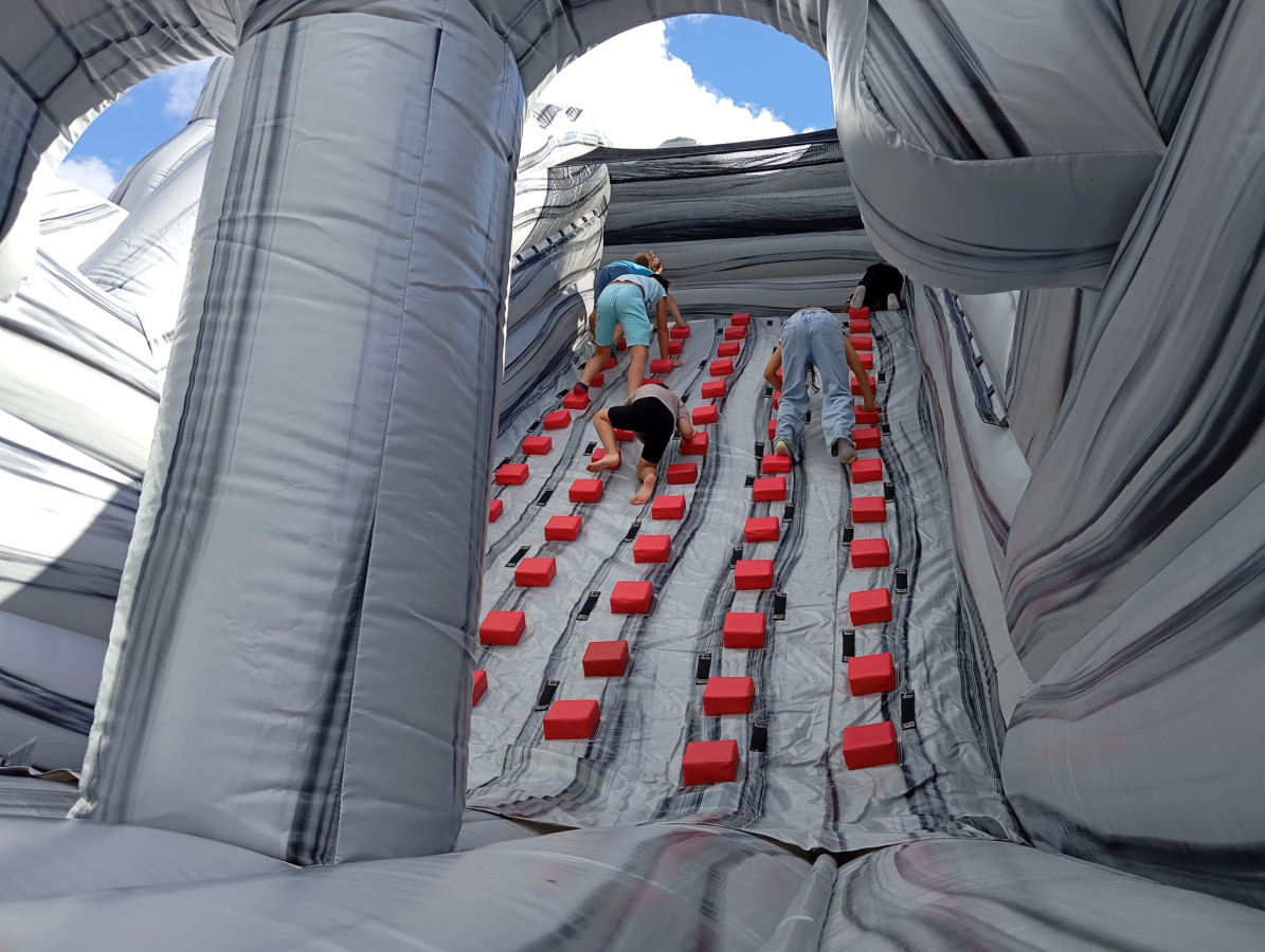 Je to horolezecká stěna nebo nafukovací skluzavka? Obojí! Nejprve se zdolává horolezecká stěna uprostřed atrakce a pak sklouznutí pro každého soutěžícího zvlášť. Kdo je první dole, ten vítězí.