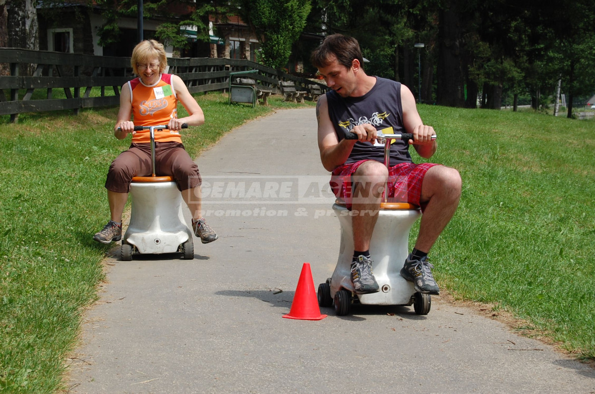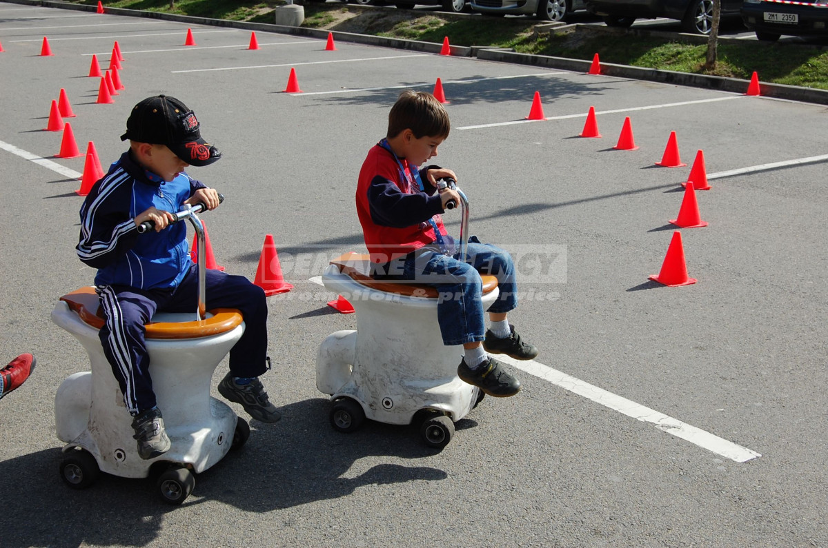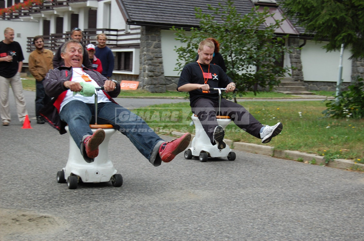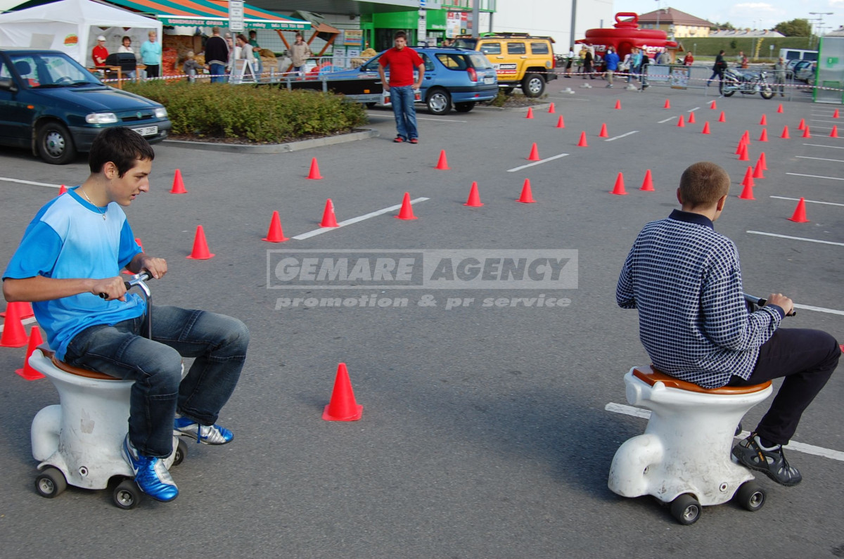 Jezdící záchodky jsou nejzábavnější atrakcí v naší nabídce. Jezdící záchodky mají záchodovou mísu s motorkem a řídítky, stačí jen zaujmout správný „posez“ a můžete vyrazit závodit. Atrakce jezdící záchodky je jediná v ČR a zpestří každou firemní akci, netradiční prezentaci, vánoční večírek nebo teambuilding.