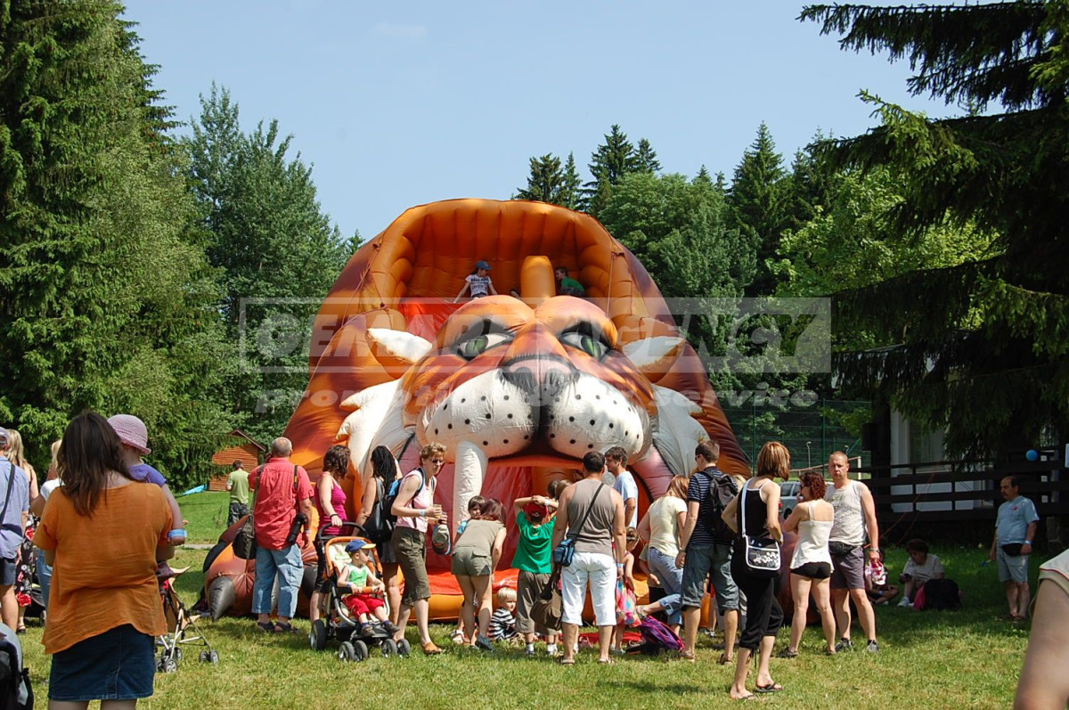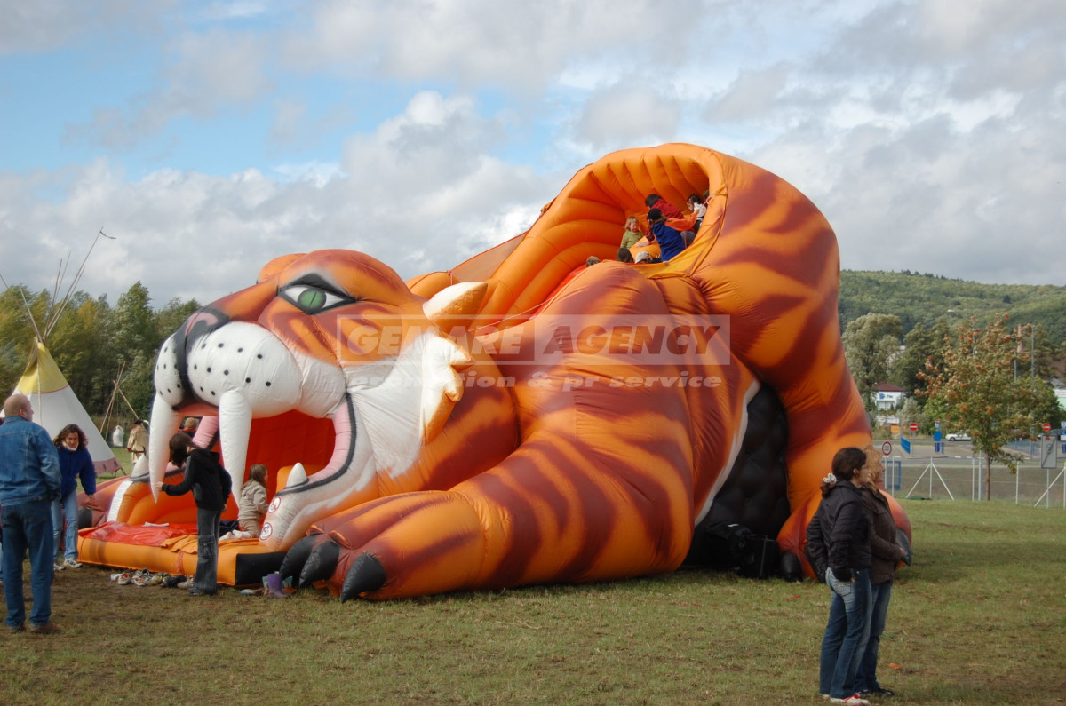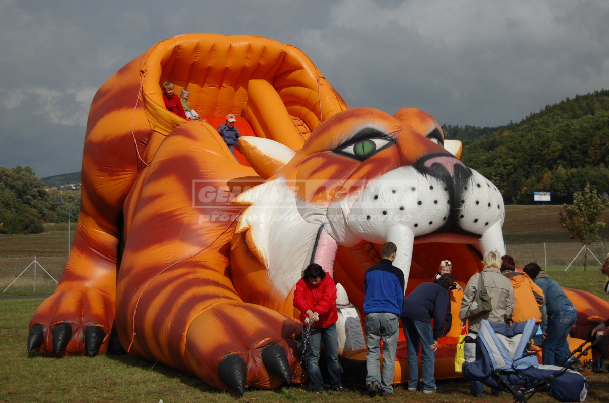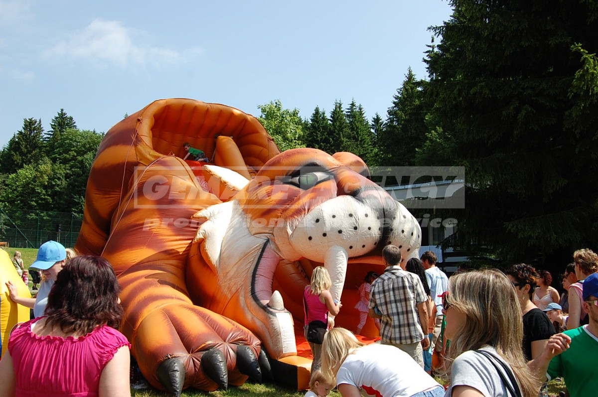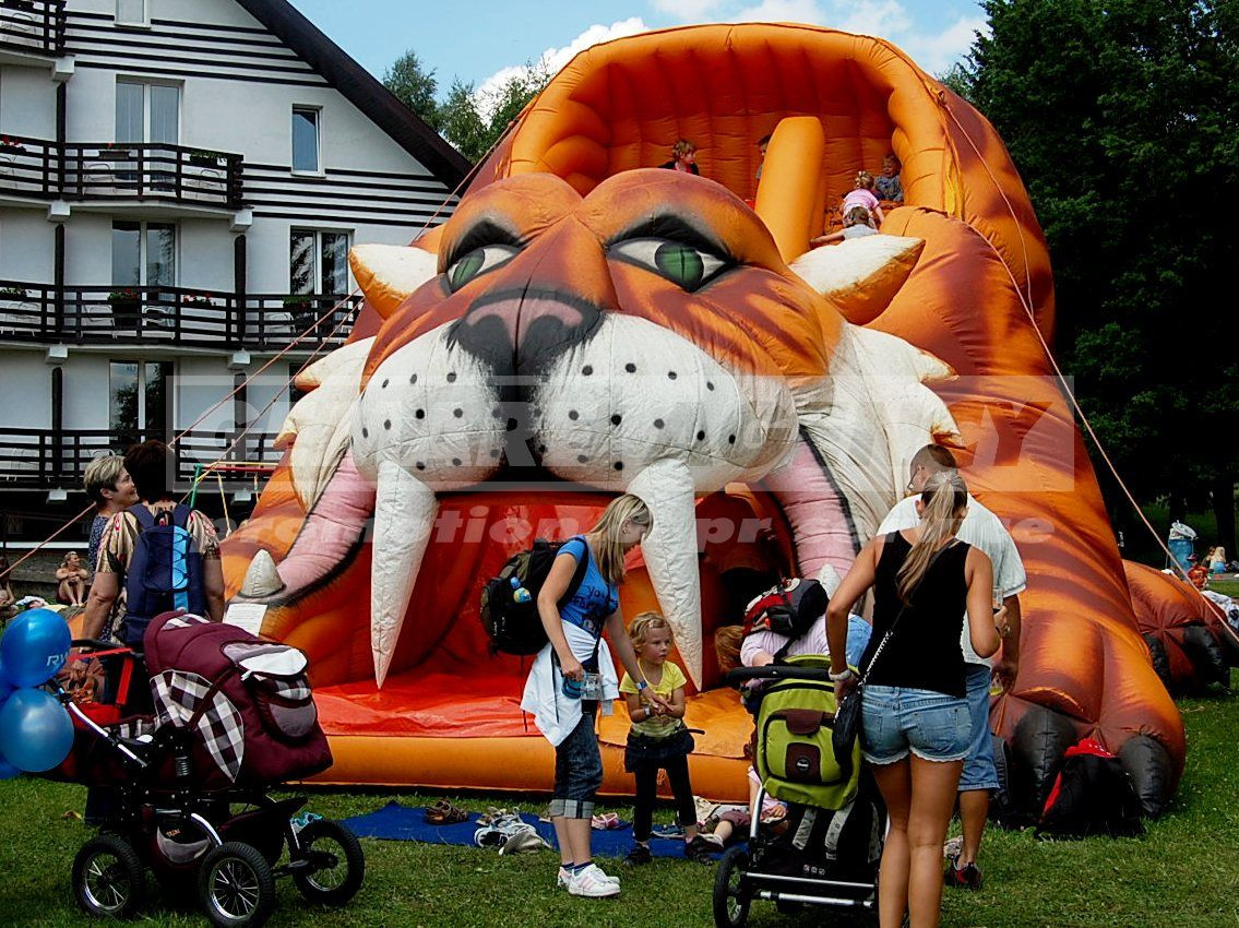 Jedinečná nafukovací skluzavka potěší i ty nejnáročnější zákazníky, kterří hledají to nejlepší k pronájmu mezi nafukovacími skluzavkami. Nafukovací skluzavka Tygr poutá svojí velikostí, barevností a obrovskými tesáky. I přes to, děti nafukovací skluzavku Tygr milují. Pronájem nafukovací skluzavky Tygr je možné kombinovat i s pronájmem skákacího hradu Tygr.